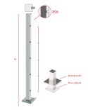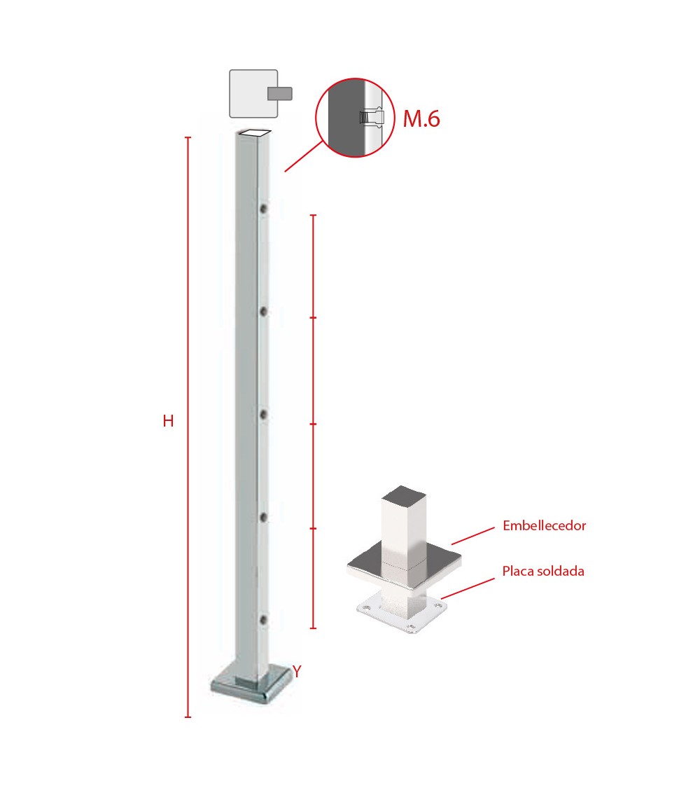 Poste Cuadrado 40 mm de Acero Inoxidable 316 Brillo y Satinado con Rosa Métrica M6 Lateral y Anclaje en la Base