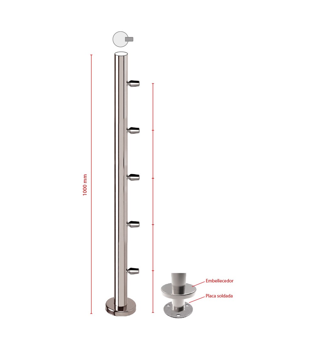 Poste Redondo 43 mm de Acero Inoxidable 316 Brillo y Satinado con Conectores Redondos Laterales