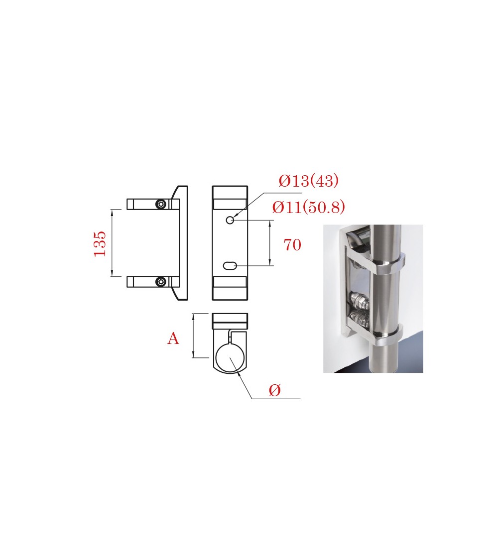 Ref.13098.13: Soporte lateral de acero inoxidable para colocar tubos de 50.8 mm de diámetro.