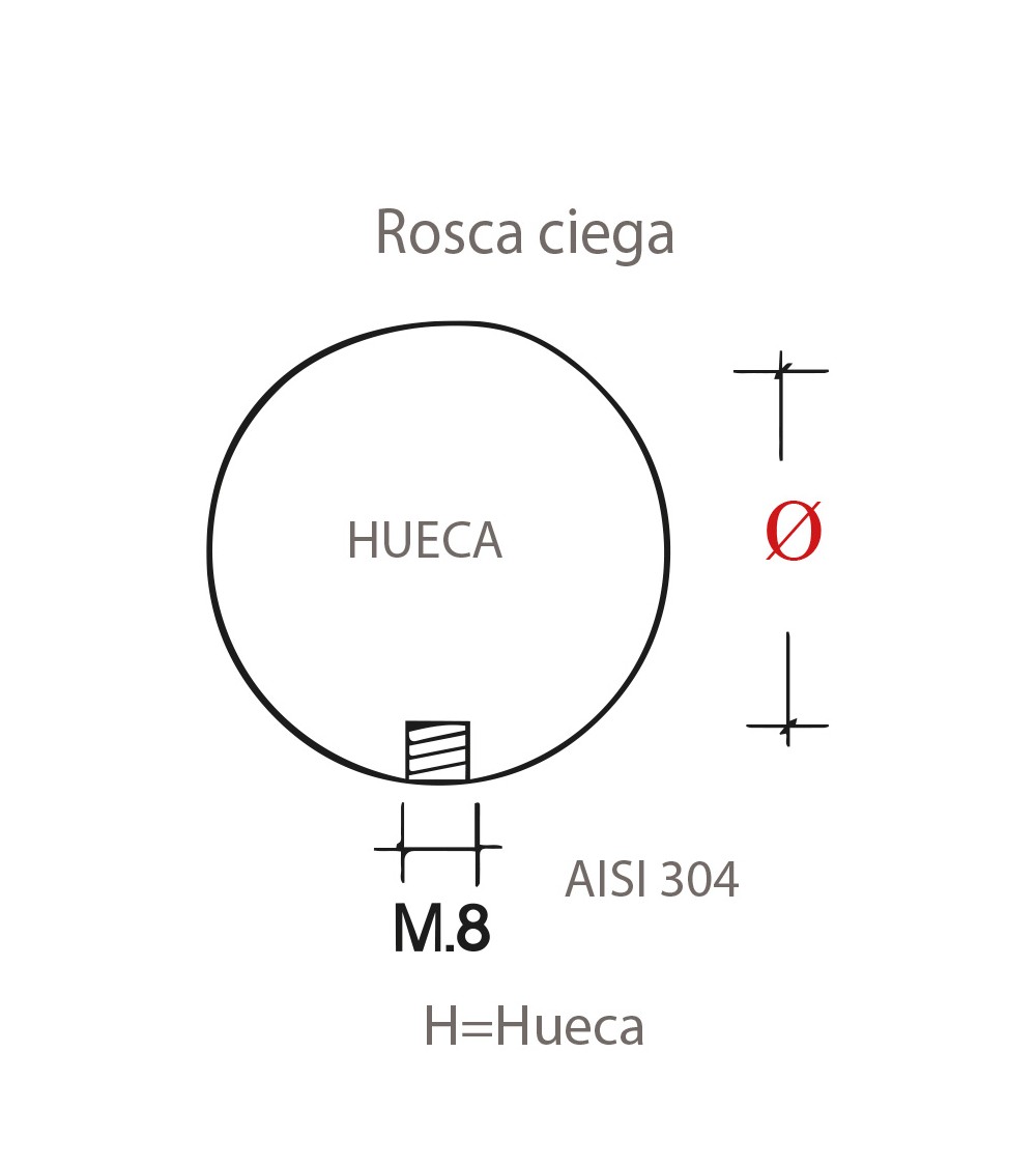 Bola de acero inoxidable 316 brillo con rosca métrica ciega para colocar en tubos, barras y herrajes con referencia 13089 y referencia 13090: