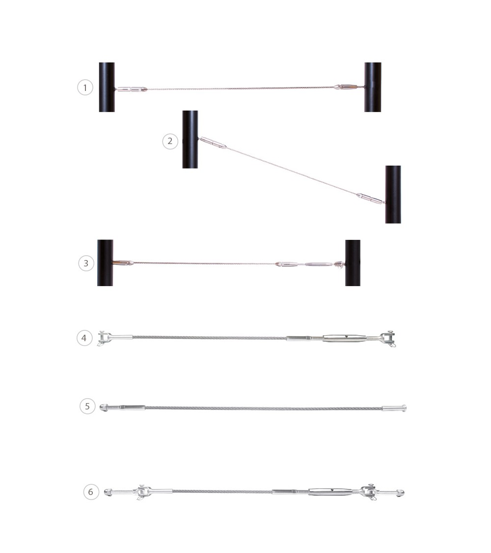 · Para facilitar el montaje, el tensor permite tensar el cable de forma manual. Además, gracias a un sistema rotatorio se pueden crear ángulos de hasta 30º. La longitud máxima ente pilares es de 10 metros.