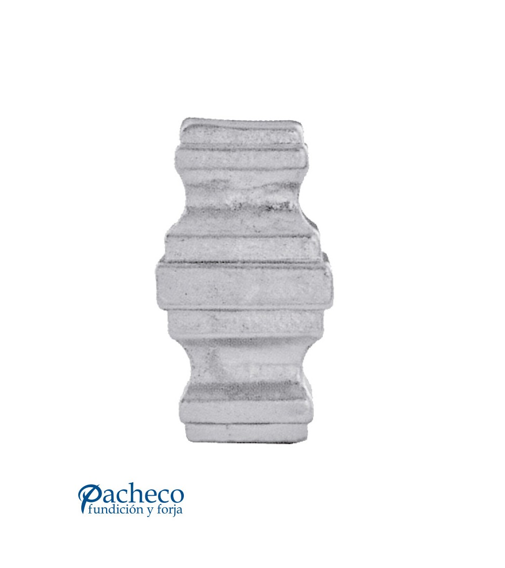 Macolla de aluminio fundido utilizado como forja decorativa fabricado con aluminio fundido con molde para tubo cuadrado. Este accesorio en aluminio fundido se utiliza como adorno en puertas de forja, ventanas de forja o balcones de forja. Se combina con balaustres de hierro forjado, balaustres de hierro fundido o balaustre de aluminio fundido. La medida estándar es de 83 mm alto x 44 mm ancho. Piezas y accesorios de hierro fundido a medida, también realizamos cualquier diseño de hierro fundido y forja decorativa. Consulta a nuestro equipo de diseño especializado. Aquí los límites del metal, los pones tú. Llámanos para informarte al 923 24 33 98 o escríbenos a info@pachecoforja.com