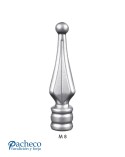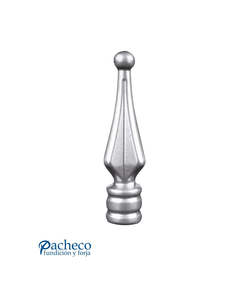 Lanza de aluminio fundido utilizado como remate de forja decorativa fabricado con aluminio fundido con molde. Este accesorio en aluminio fundido se utiliza como remate de forja en puertas de forja o balcones de forja. Va roscado en balaustres de hierro forjado o balaustres de hierro fundido. La rosca es M8. La medida estándar es de 120 mm alto x 28 mm ancho. Piezas y accesorios de aluminio fundido, también realizamos cualquier diseño de hierro fundido y forja decorativa. Consulta a nuestro equipo de diseño especializado. Aquí los límites del metal, los pones tú. Llámanos para informarte al 923 24 33 98 o escríbenos a info@pachecoforja.com