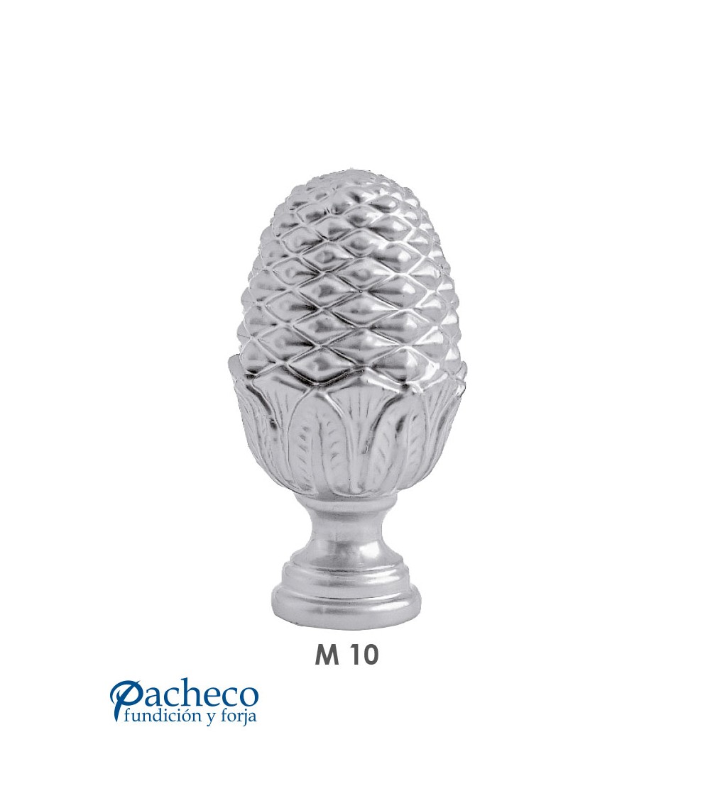 Remate de aluminio fundido utilizado como forja decorativa fabricado con aluminio fundido con molde. Este accesorio en aluminio fundido se utiliza como adorno en puertas de forja, ventanas de forja o balcones de forja. Va roscado en balaustres de aluminio fundido, balaustres de hierro fundido o balaustres de hierro forjado. La medida estándar es 130 mm alto x 65 mm ancho. Tiene una rosca M10. Piezas y accesorios de aluminio fundido a medida, también realizamos cualquier diseño de hierro fundido y forja decorativa. Consulta a nuestro equipo de diseño especializado. Aquí los límites del metal, los pones tú. Llámanos para informarte al 923 24 33 98 o escríbenos a info@pachecoforja.com