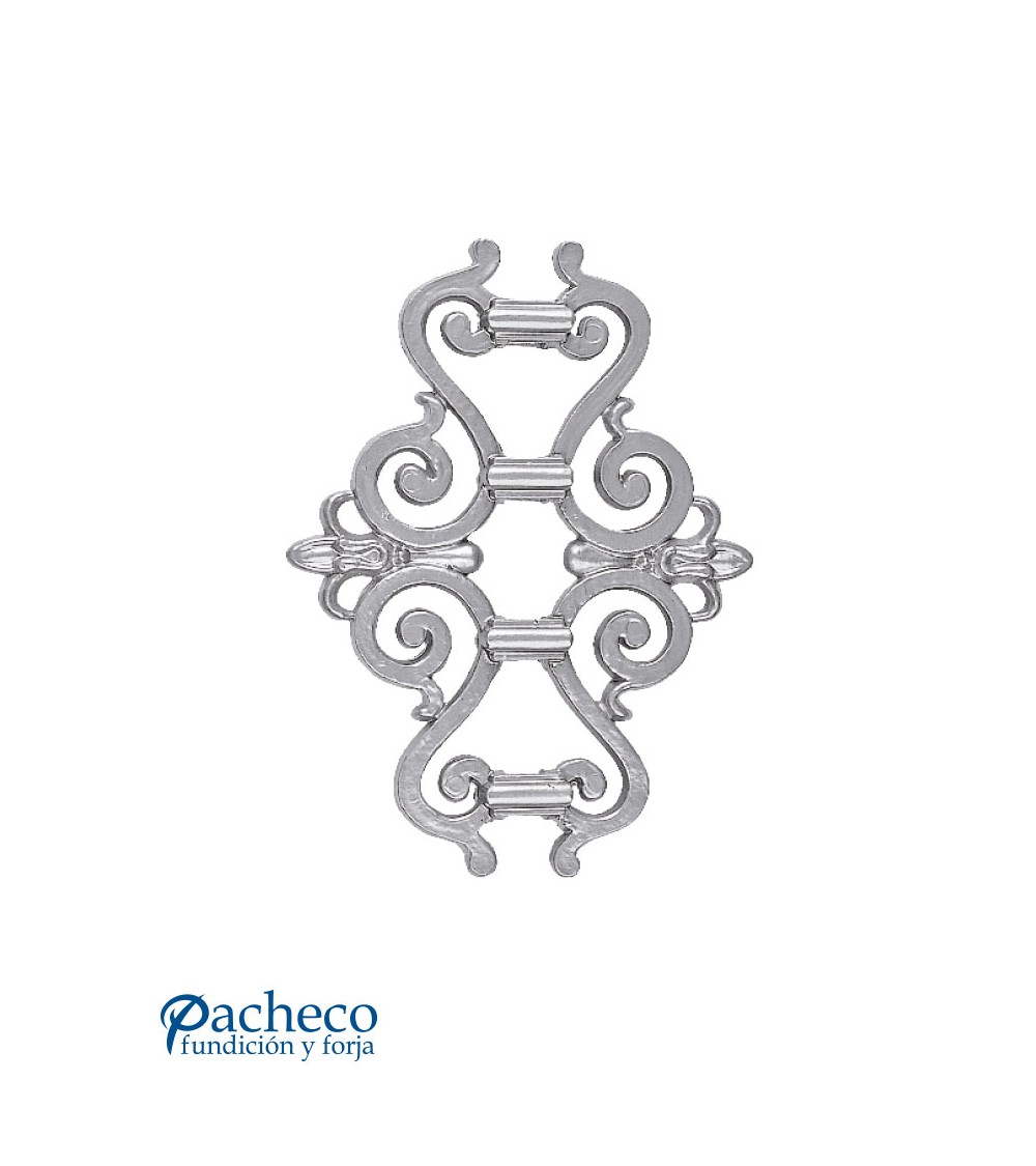 Pieza central de aluminio fundido utilizado como forja decorativa fabricado con aluminio fundido con molde. Este accesorio en aluminio fundido se utiliza en el extremo inferior de puertas de forja, ventanas de forja o balcones de forja. Se combina con balaustres de hierro forjado, balaustres de hierro fundido o balaustres de hierro forjado. La medida estándar es 195 mm alto x 460 mm ancho o 290 mm alto x 555 mm ancho. Aluminio natural, previo encargo se sirven lacados en cualquier color. Relieve a dos caras. Piezas y accesorios de hierro forjado a medida, también realizamos cualquier diseño de hierro fundido y forja decorativa. Consulta a nuestro equipo de diseño especializado. Aquí los límites del metal, los pones tú. Llámanos para informarte al 923 24 33 98 o escríbenos a info@pachecoforja.com