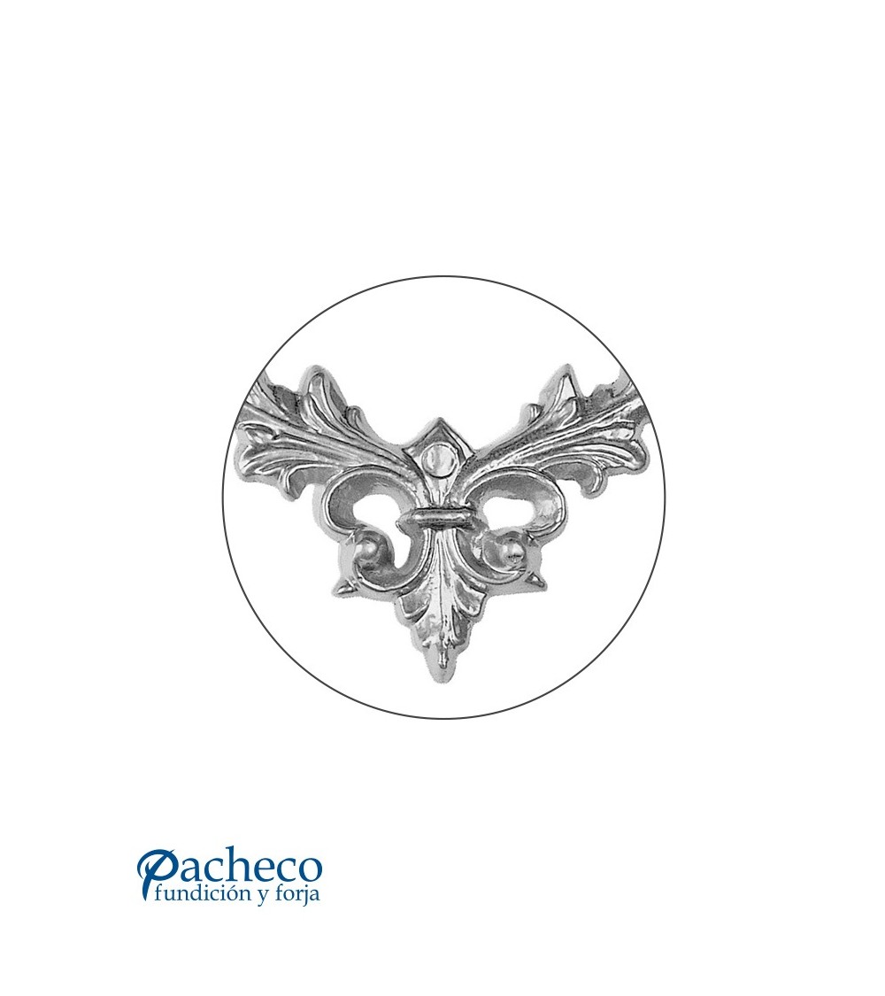 Plafón de aluminio fundido utilizado como forja decorativa fabricado con aluminio fundido con molde. Este accesorio en aluminio fundido se utiliza en el extremo inferior de puertas de forja, ventanas de forja o balcones de forja. Se combina con balaustres de hierro forjado, balaustres de hierro fundido o balaustres de hierro forjado. La medida estándar es 130 mm alto x 130 mm ancho. Aluminio natural, previo encargo se sirven lacados en cualquier color. Relieve a una cara. Piezas y accesorios de hierro forjado a medida, también realizamos cualquier diseño de hierro fundido y forja decorativa. Consulta a nuestro equipo de diseño especializado. Aquí los límites del metal, los pones tú. Llámanos para informarte al 923 24 33 98 o escríbenos a info@pachecoforja.com