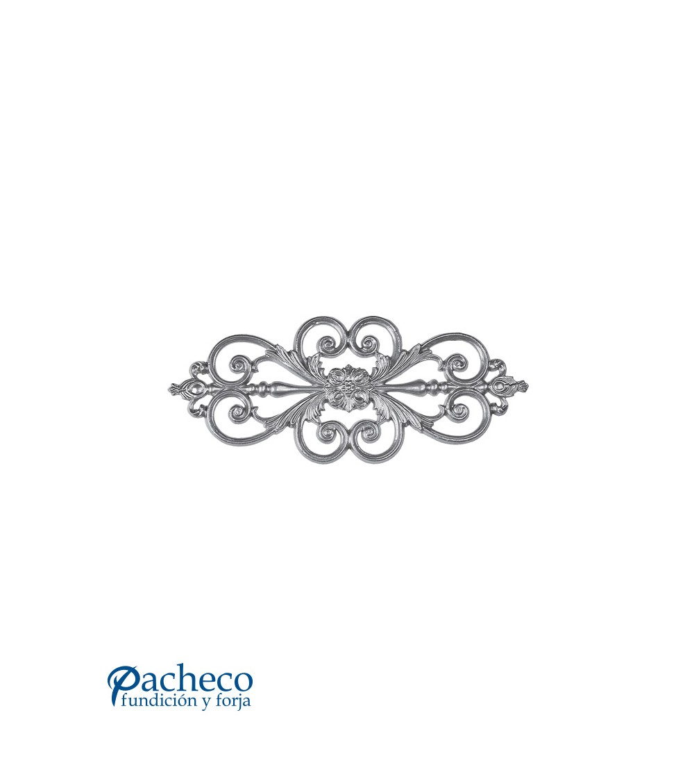 Plafón de aluminio fundido utilizado como forja decorativa fabricado con aluminio fundido con molde. Este accesorio en aluminio fundido se utiliza en el extremo inferior de puertas de forja, ventanas de forja o balcones de forja. Se combina con balaustres de hierro forjado, balaustres de hierro fundido o balaustres de hierro forjado. La medida estándar es 195 mm alto x 460 mm ancho o 290 mm alto x 555 mm ancho. Aluminio natural, previo encargo se sirven lacados en cualquier color. Relieve a una cara. Piezas y accesorios de hierro forjado a medida, también realizamos cualquier diseño de hierro fundido y forja decorativa. Consulta a nuestro equipo de diseño especializado. Aquí los límites del metal, los pones tú. Llámanos para informarte al 923 24 33 98 o escríbenos a info@pachecoforja.com