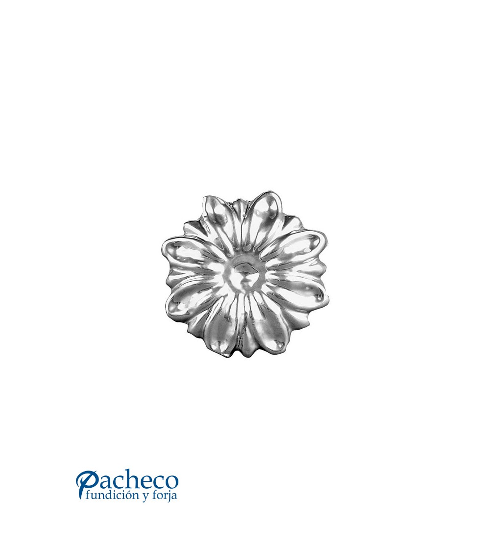 Rosetón de aluminio fundido utilizado como forja decorativa fabricado con aluminio fundido con molde. Este accesorio en aluminio fundido se utiliza en el extremo inferior de puertas de forja, ventanas de forja o balcones de forja. Se combina con balaustres de hierro forjado, balaustres de hierro fundido o balaustres de hierro forjado. La medida estándar es 65 mm diámetro. Aluminio natural, previo encargo se sirven lacados en cualquier color. Relieve a una cara. Piezas y accesorios de hierro forjado a medida, también realizamos cualquier diseño de hierro fundido y forja decorativa. Consulta a nuestro equipo de diseño especializado. Aquí los límites del metal, los pones tú. Llámanos para informarte al 923 24 33 98 o escríbenos a info@pachecoforja.com