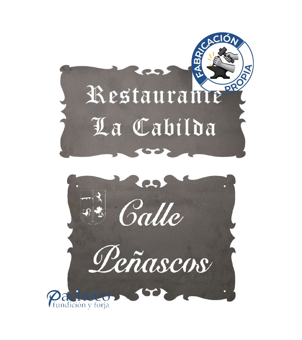 Placa de hierro contorno elegante con volutas para señalética personalizada de negocios y portales