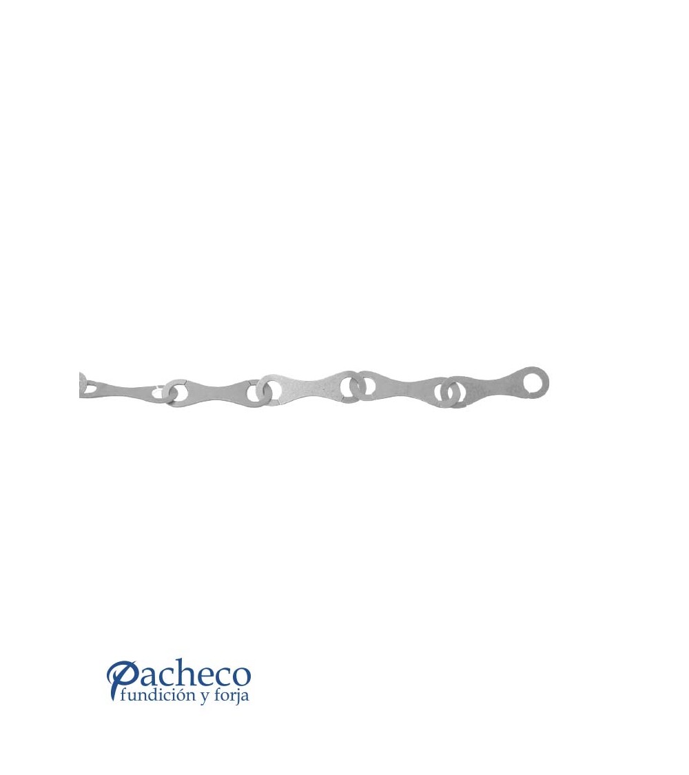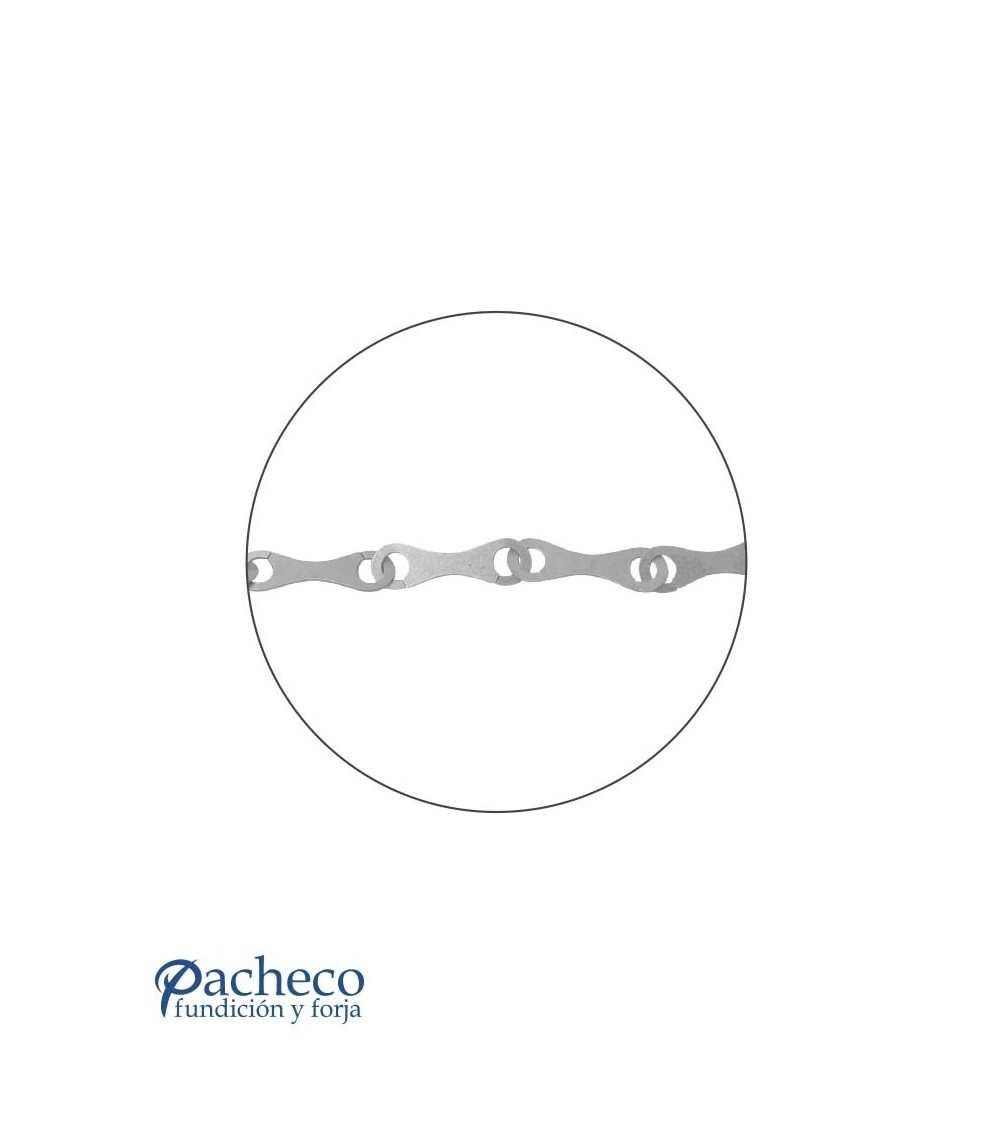 · Eslabones tipo lazo grande de 150 mm largo × 43 mm alto × 3 mm de espesor, unidos entre sí mediante soldadura tradicional de forja.