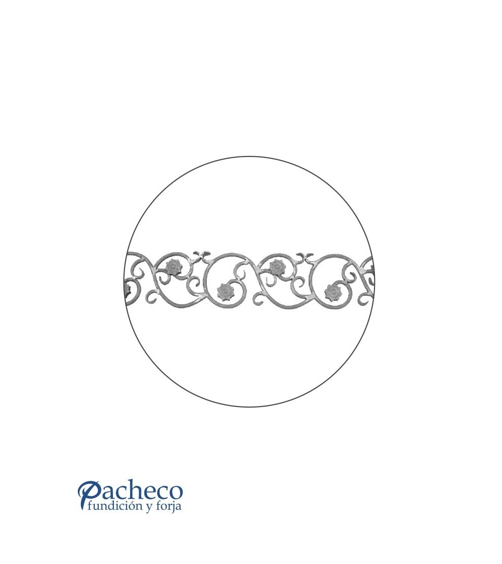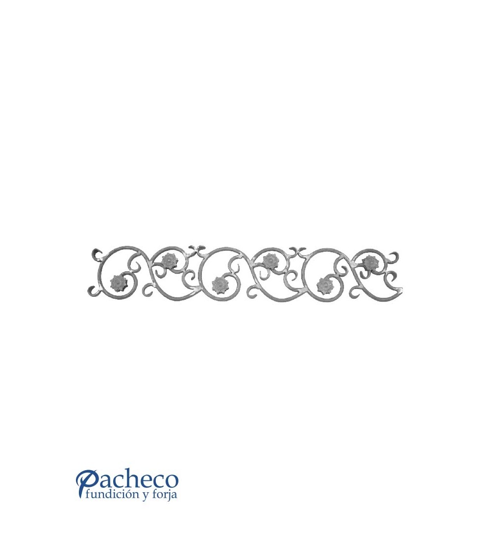 Solera de hierro forjado utilizado como forja decorativa fabricado con hierro dulce, maleable y forjado en caliente. Este accesorio en hierro forjado se utiliza en balcones y ventanas, verjas de hierro forjado, rejas y cancelas de hierro forjado. Se puede combinar con balaustres, balaustradas y jabalcones. La medida estándar es de 170 mm ancho x 970 mm largo. El diseño tiene el mismo relieve por las dos caras. Piezas y accesorios para forja a medida, también realizamos cualquier diseño de forja decorativa y forja artística. Consulta a nuestro equipo de diseño especializado. Aquí los límites del metal, los pones tú. Llámanos para informarte al 923 24 33 98 o escríbenos a info@pachecoforja.com