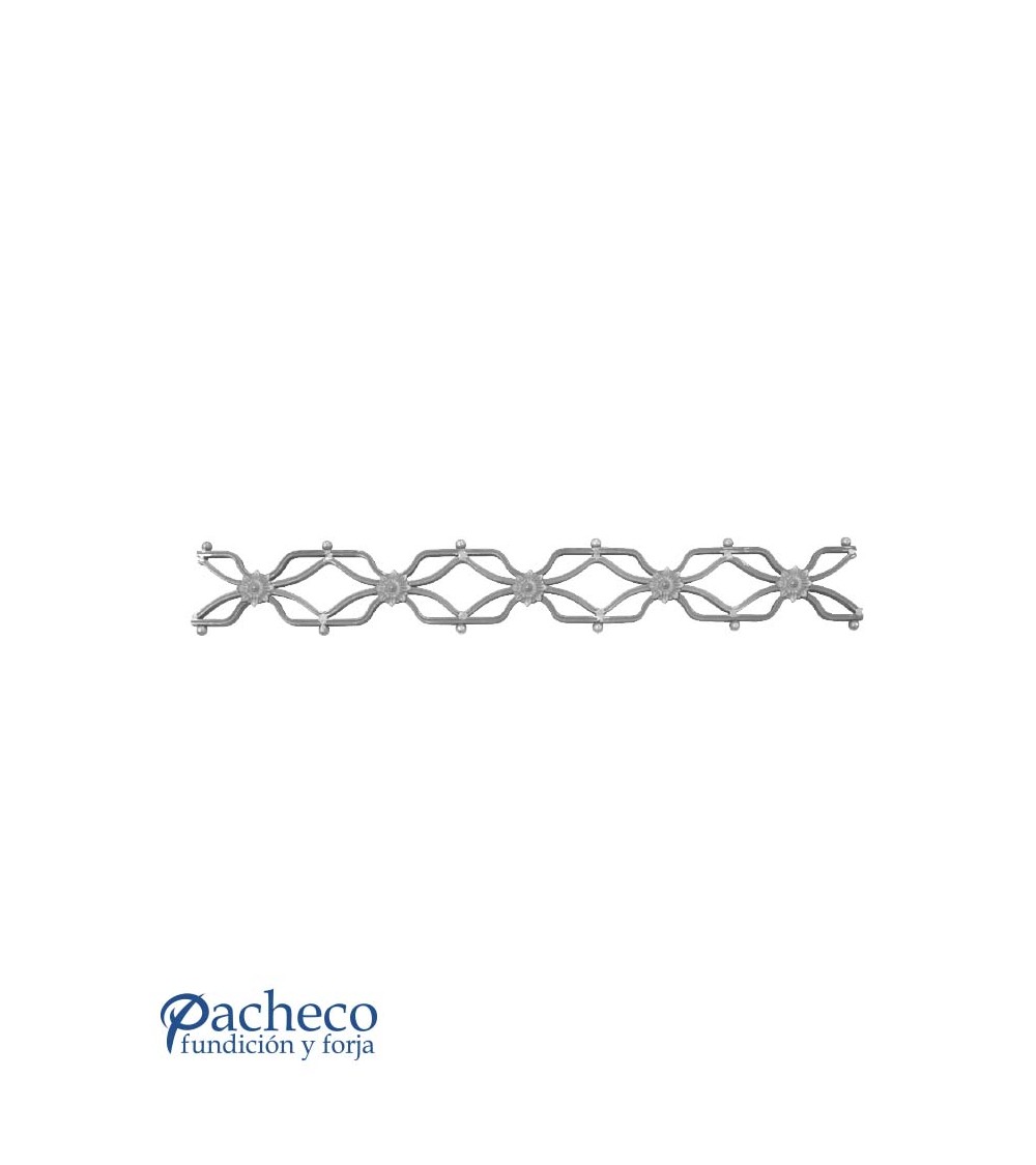 Solera de hierro forjado utilizado como forja decorativa fabricado con hierro dulce, maleable y forjado en caliente. Este accesorio en hierro forjado se utiliza en balcones y ventanas, verjas de hierro forjado, rejas y cancelas de hierro forjado. Se puede combinar con balaustres, balaustradas y jabalcones. La medida estándar es de 135 mm ancho x 950 mm largo. El diseño tiene el mismo relieve por las dos caras. Piezas y accesorios para forja a medida, también realizamos cualquier diseño de forja decorativa y forja artística. Consulta a nuestro equipo de diseño especializado. Aquí los límites del metal, los pones tú. Llámanos para informarte al 923 24 33 98 o escríbenos a info@pachecoforja.com