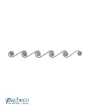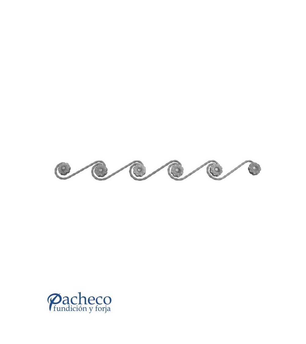 Solera de hierro forjado utilizado como forja decorativa fabricado con hierro dulce, maleable y forjado en caliente. Este accesorio en hierro forjado se utiliza en balcones y ventanas, verjas de hierro forjado, rejas y cancelas de hierro forjado. Se puede combinar con balaustres, balaustradas y jabalcones. La medida estándar es de 110 mm ancho x 1000 mm largo. El diseño tiene el mismo relieve por las dos caras. Piezas y accesorios para forja a medida, también realizamos cualquier diseño de forja decorativa y forja artística. Consulta a nuestro equipo de diseño especializado. Aquí los límites del metal, los pones tú. Llámanos para informarte al 923 24 33 98 o escríbenos a info@pachecoforja.com