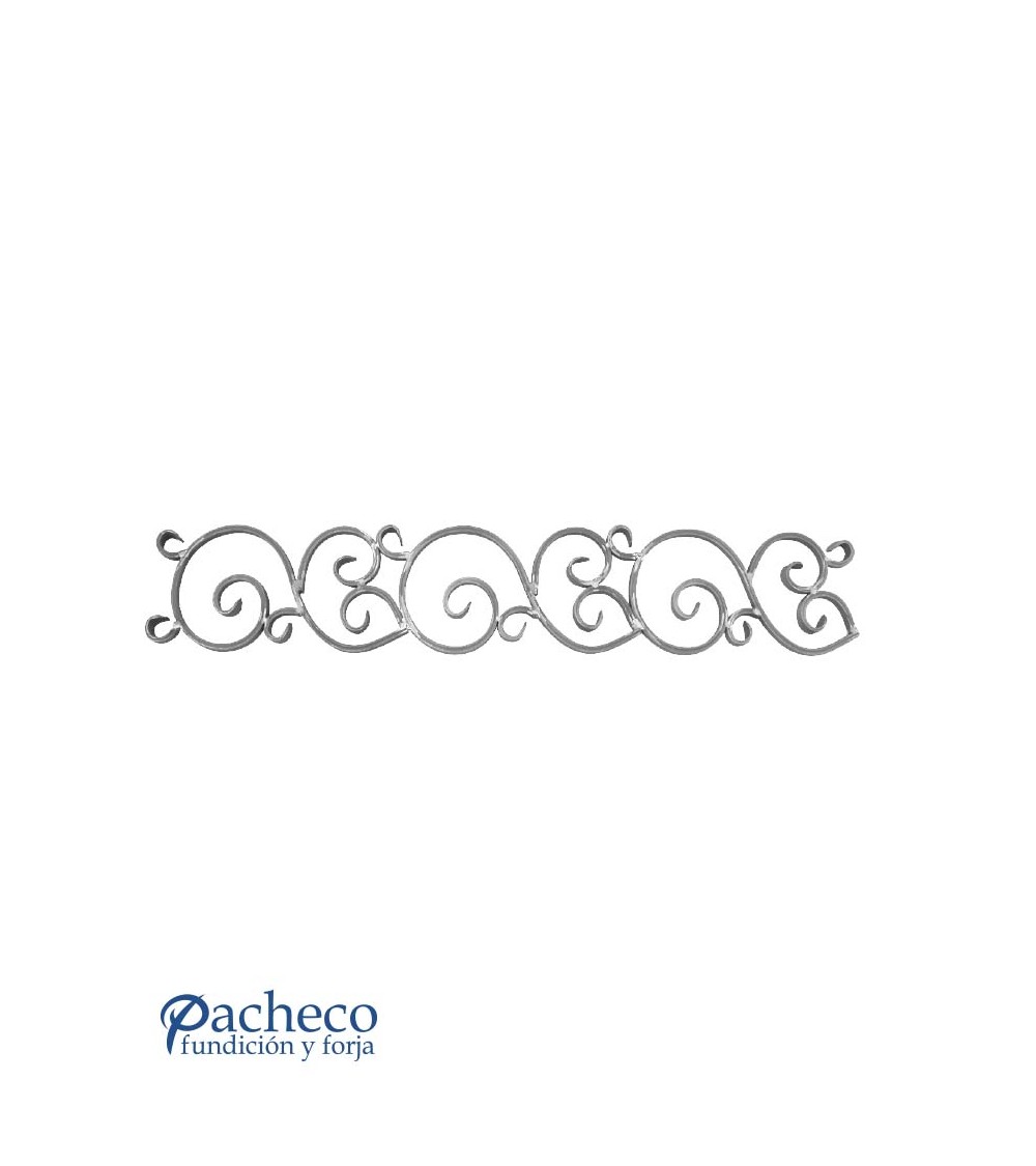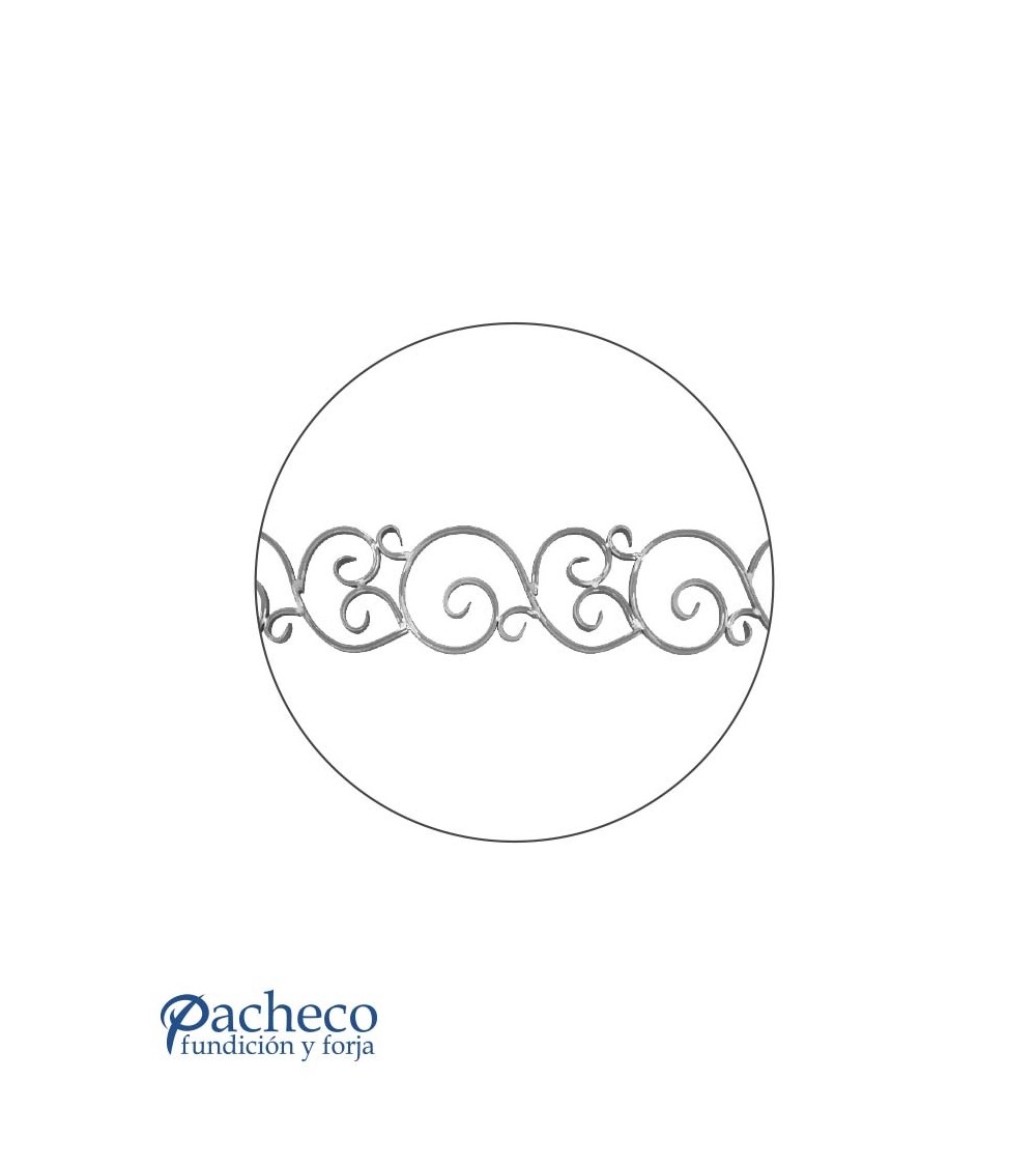 Solera de hierro forjado utilizado como forja decorativa fabricado con hierro dulce, maleable y forjado en caliente. Este accesorio en hierro forjado se utiliza en balcones y ventanas, verjas de hierro forjado, rejas y cancelas de hierro forjado. Se puede combinar con balaustres, balaustradas y jabalcones. La medida estándar es de 170 mm ancho x 970 mm largo. Piezas y accesorios para forja a medida, también realizamos cualquier diseño de forja decorativa y forja artística. Consulta a nuestro equipo de diseño especializado. Aquí los límites del metal, los pones tú. Llámanos para informarte al 923 24 33 98 o escríbenos a info@pachecoforja.com