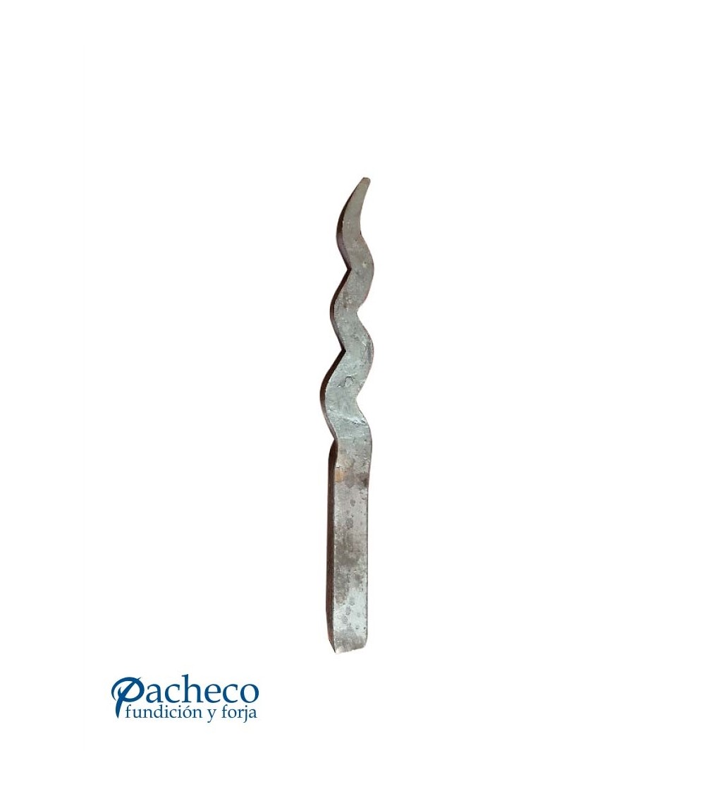 Lanza de hierro forjado con punta acabada en ondas utilizada como adorno de forja decorativa. Fabricada con hierro dulce, maleable y forjado en caliente para la sujeción de rejas o vallas de hierro forjado con referencia 07052.01, referencia 07053: