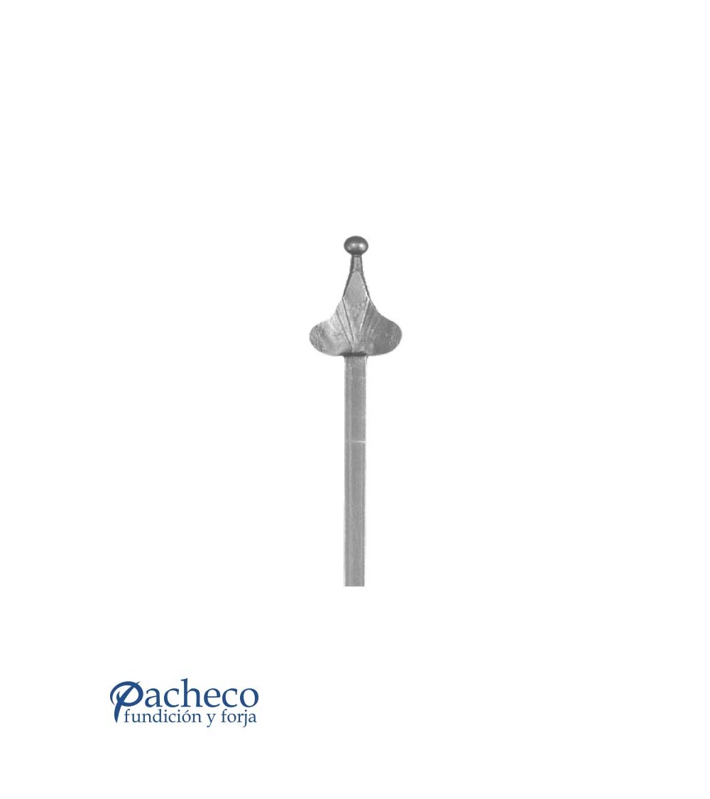 Lanza de hierro forjado con terminación en redondo con óvalo machado utilizada como adorno de forja decorativa. Fabricada con hierro dulce, maleable y forjado en caliente para la sujeción de rejas o vallas de hierro forjado con referencia 07069: