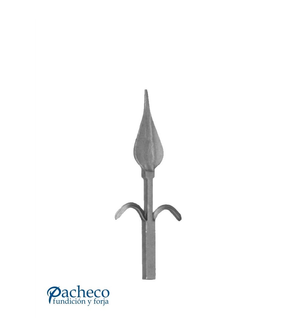 Lanza de hierro forjado en forma de hoja utilizada como adorno de forja decorativa. Fabricada con hierro dulce, maleable y forjado en caliente para la sujeción de rejas o vallas de hierro forjado con referencia 07047: