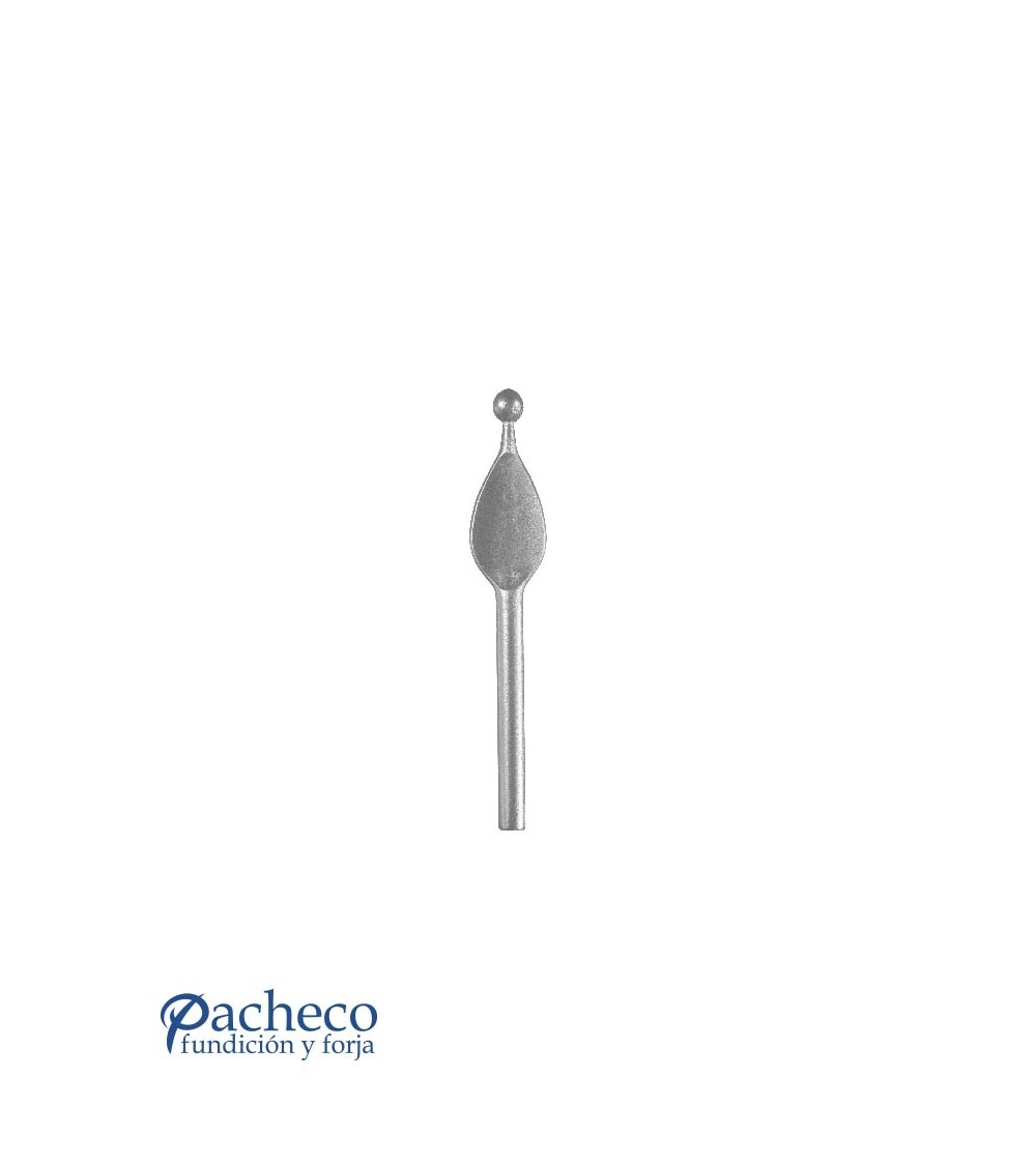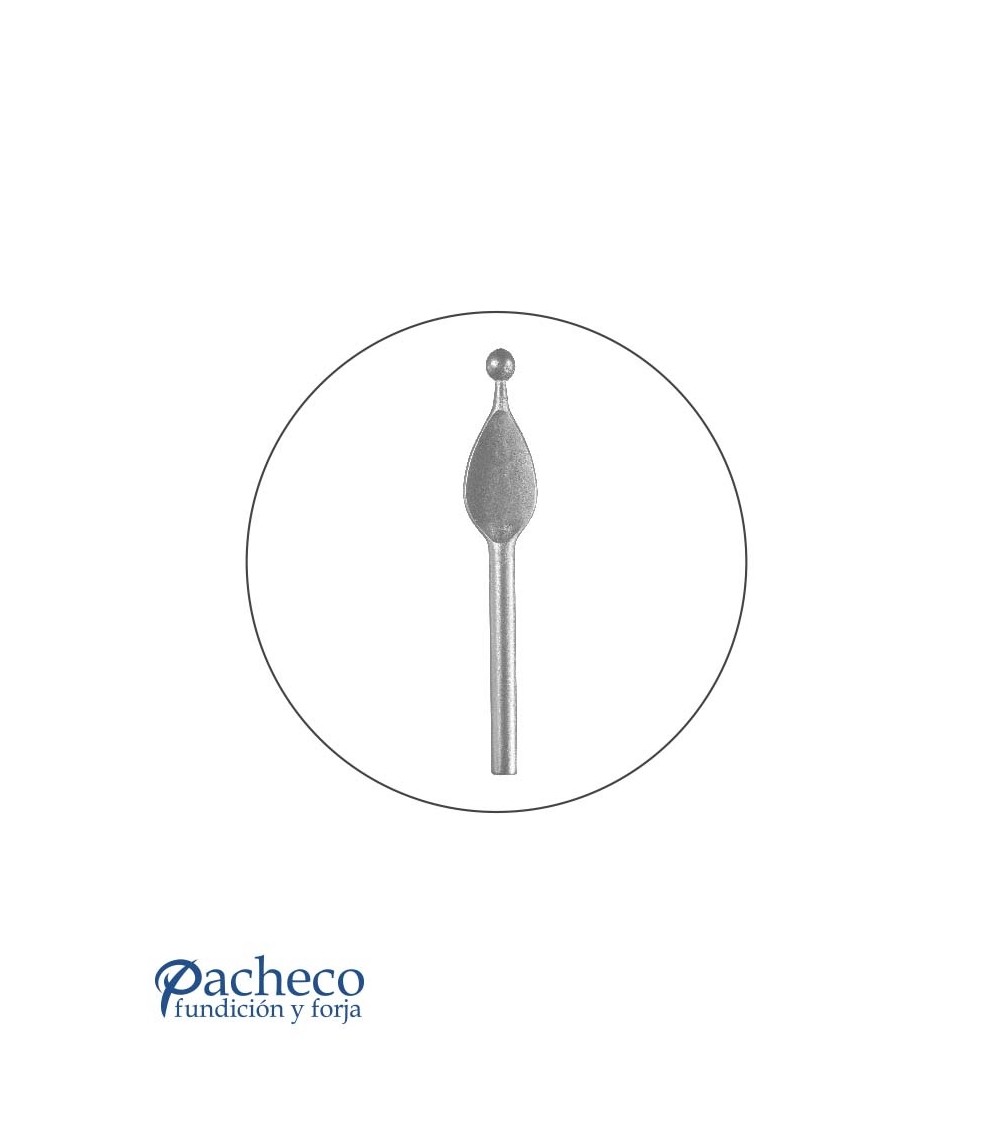 Lanza de hierro forjado con punta acabada en redondo con óvalo machado utilizada como adorno de forja decorativa. Fabricada con hierro dulce, maleable y forjado en caliente para la sujeción de rejas o vallas de hierro forjado con referencia 07059, referencia 07061.01 y referencia 07062: