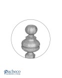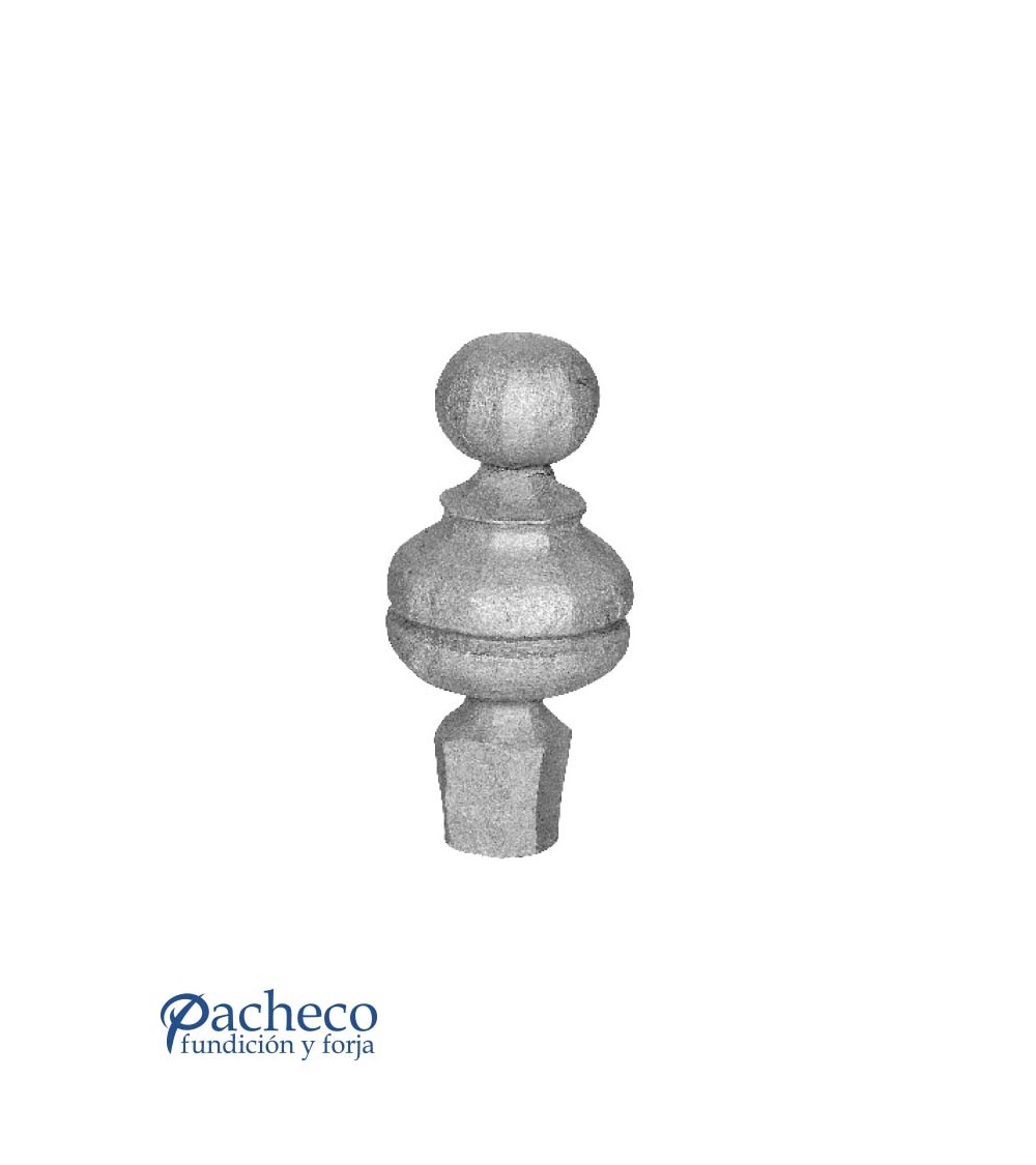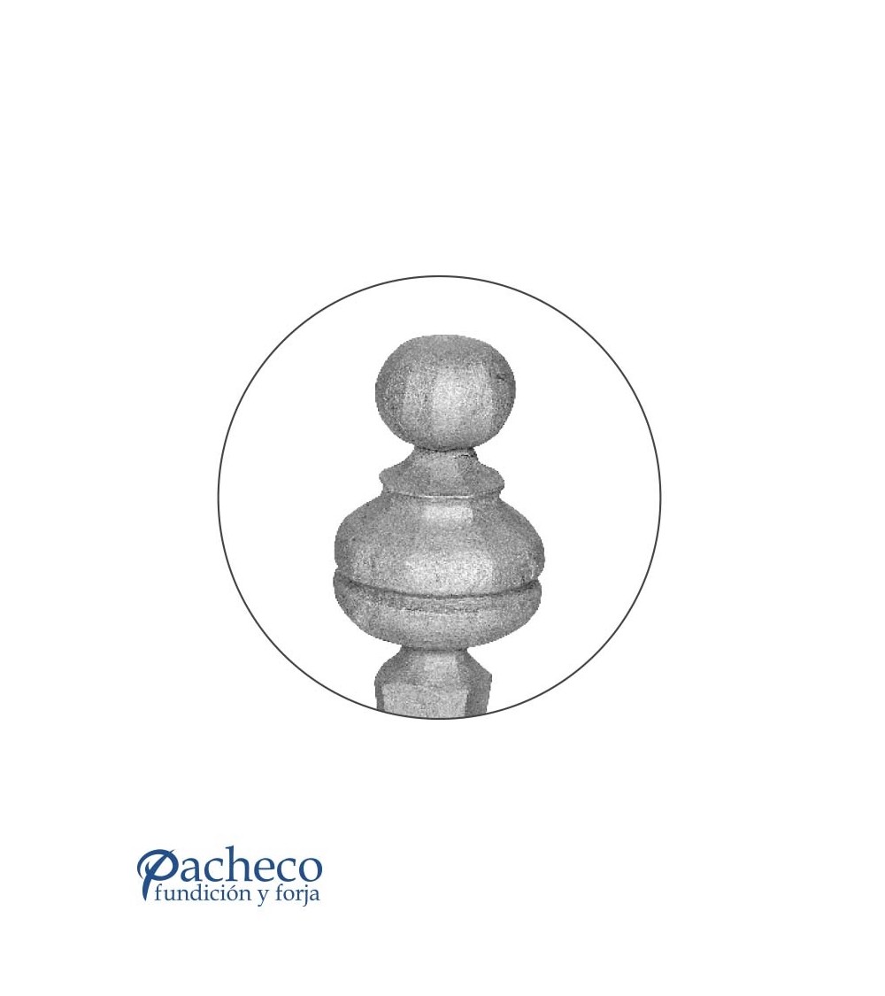 Remate de forja labrado utilizado como remate de forja decorativa fabricado con hierro dulce, maleable y forjado en caliente. Este accesorio en hierro forjado se utiliza como remate en barrotes de forja, verjas de forja o adornos de forja para rejas. Se combina con balaustres redondos. La medida estándar es de base circular de 25 mm Piezas y accesorios para forja a medida, también realizamos cualquier diseño de forja decorativa y forja artística. Consulta a nuestro equipo de diseño especializado. Aquí los límites del metal, los pones tú. Llámanos para informarte al 923 24 33 98 o escríbenos a info@pachecoforja.com