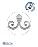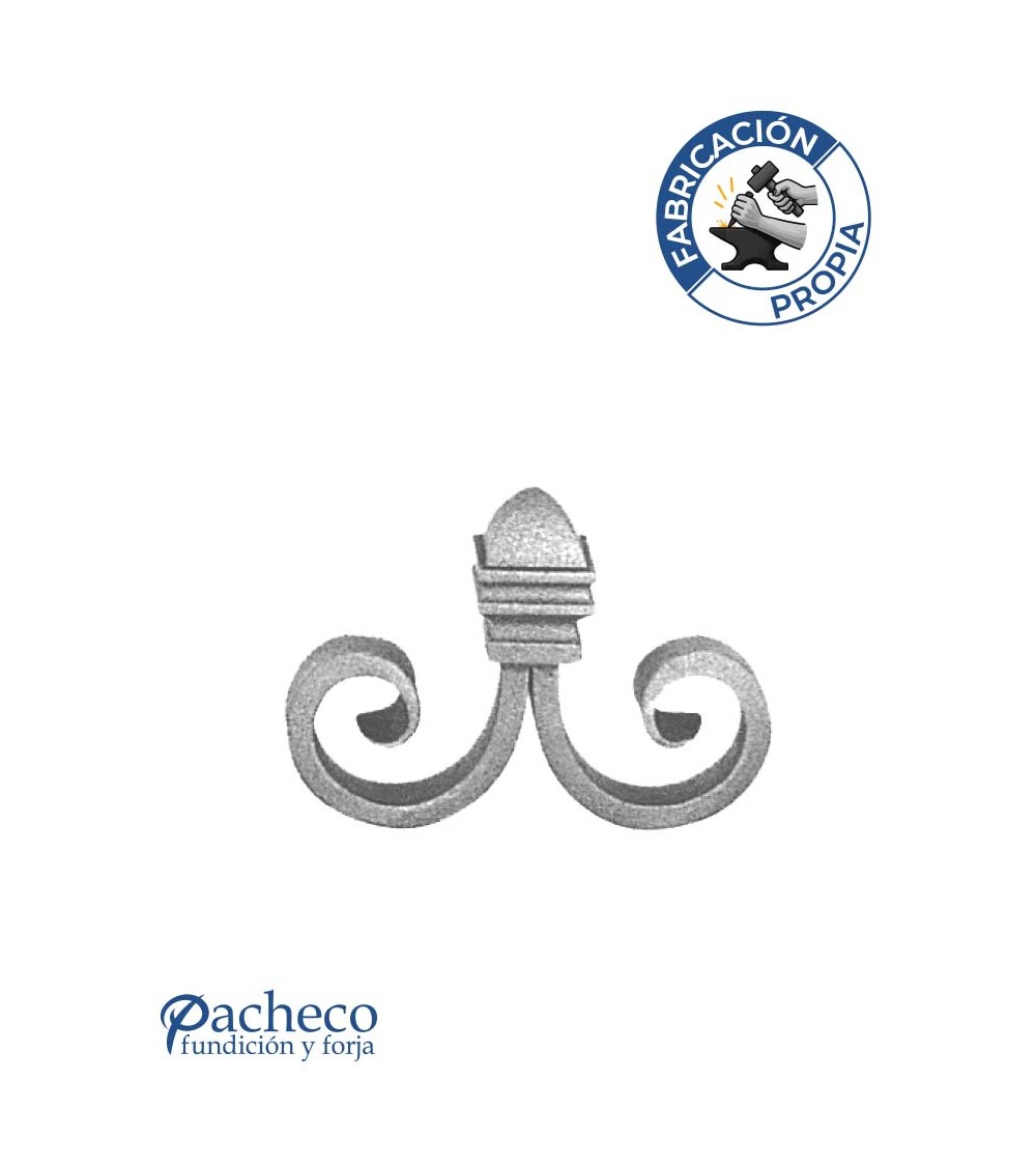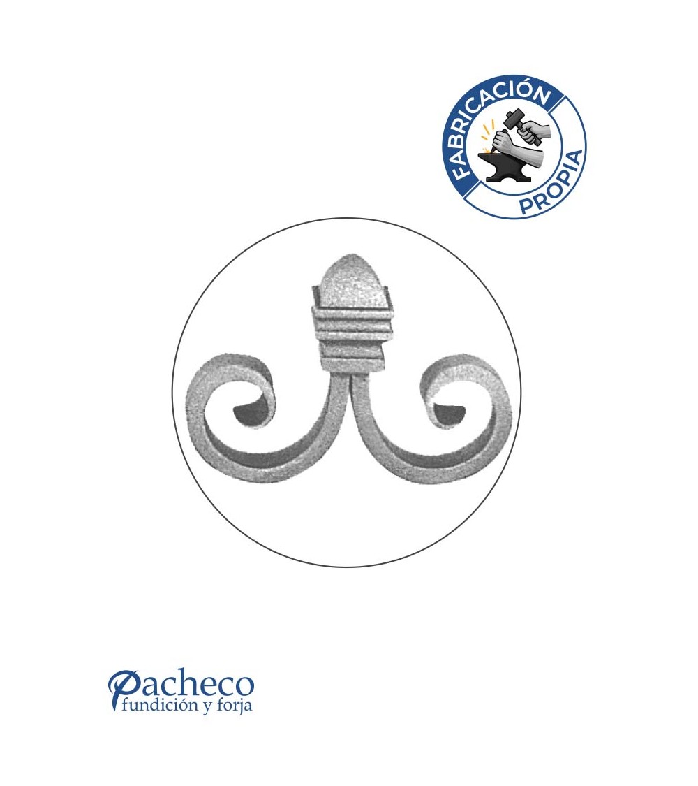 Remate de forja labrado utilizado como remate de forja decorativa fabricado con hierro dulce, maleable y forjado en caliente. Este accesorio en hierro forjado se utiliza como remate en barrotes de forja, verjas de forja o adornos de forja para rejas. Se combina con balaustres de pletina o cuadrado. El diseño es una composición de caracoles o espirales de forja. La medida estándar es de 105 mm alto x 140 mm ancho. Piezas y accesorios para forja a medida, también realizamos cualquier diseño de forja decorativa y forja artística. Consulta a nuestro equipo de diseño especializado. Aquí los límites del metal, los pones tú. Llámanos para informarte al 923 24 33 98 o escríbenos a info@pachecoforja.com