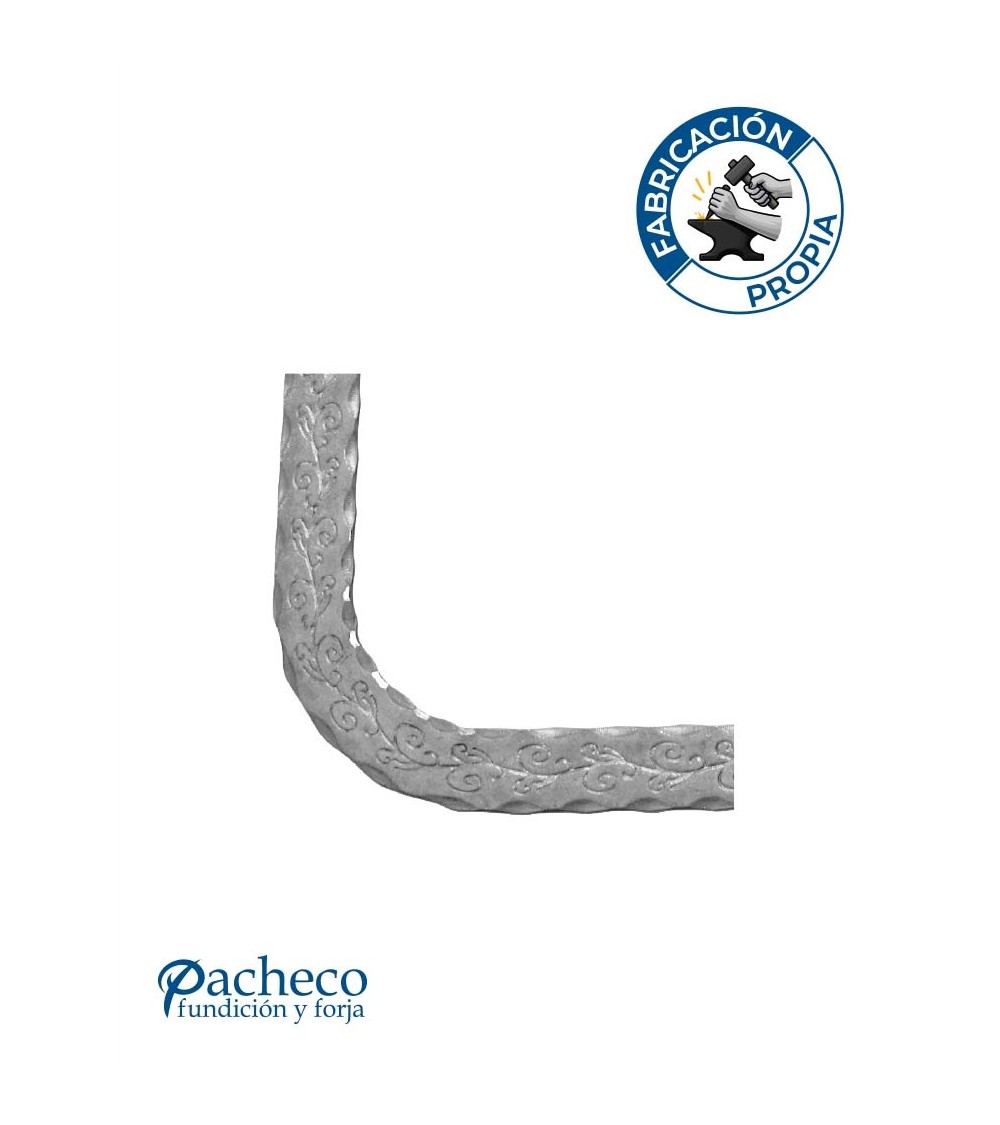 Curva de hierro forjado utilizado como forja decorativa fabricado con hierro dulce, maleable y forjado en caliente. Este accesorio en hierro forjado se utiliza para unir los pasamanos referencia 03177 La medida estándar es de 400 mm de largo x 400 mm ancho. Piezas y accesorios para forja a medida, también realizamos cualquier diseño de forja decorativa y forja artística. Consulta a nuestro equipo de diseño especializado. Aquí los límites del metal, los pones tú. Llámanos para informarte al 923 24 33 98 o escríbenos a info@pachecoforja.com