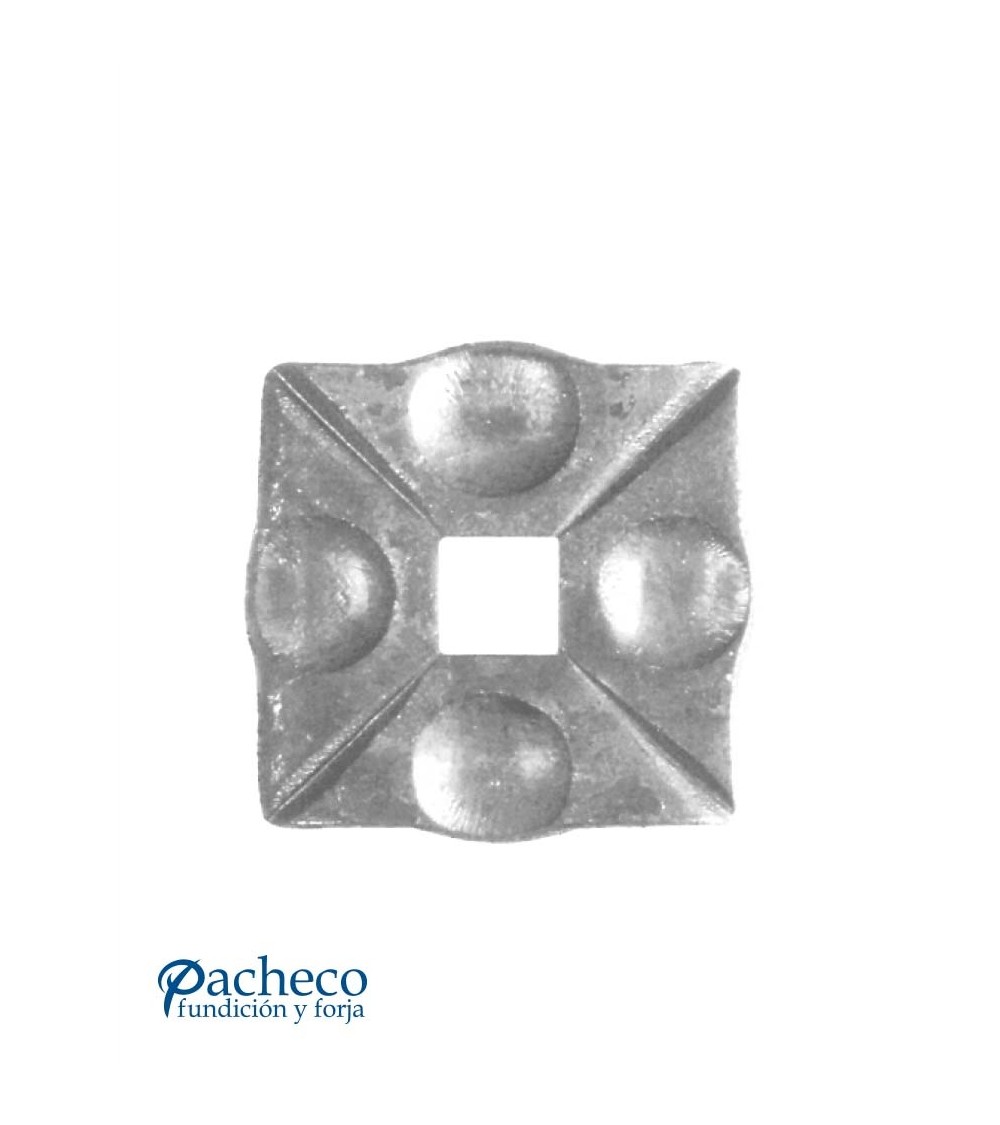 Base de hierro forjado utilizado como forja decorativa fabricado con hierro dulce, maleable y forjado en caliente. Este accesorio en hierro forjado se utiliza como soporte en rejas o barandillas de hierro forjado. Se puede combinar con balaustres de forja de sección cuadrada. Hay diferentes medidas estándar. Piezas y accesorios para forja a medida, también realizamos cualquier diseño de forja decorativa y forja artística. Consulta a nuestro equipo de diseño especializado. Aquí los límites del metal, los pones tú. Llámanos para informarte al 923 24 33 98 o escríbenos a info@pachecoforja.com