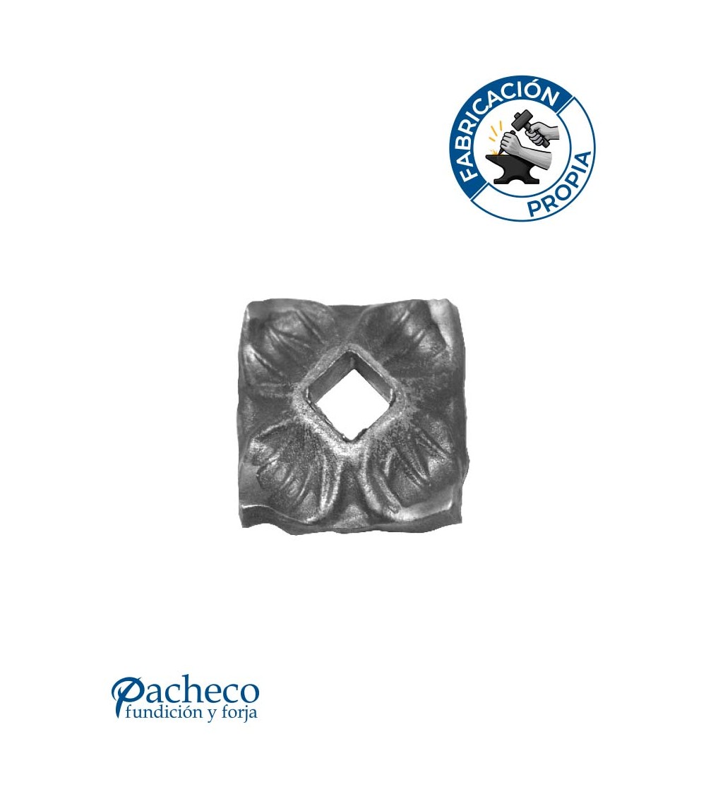 Base de hierro forjado utilizado como forja decorativa fabricado con hierro dulce, maleable y forjado en caliente. Este accesorio en hierro forjado se utiliza como soporte en rejas o barandillas de hierro forjado. Se puede combinar con balaustres de sección cuadrada. El diseño es estampado. Piezas y accesorios para forja a medida, también realizamos cualquier diseño de forja decorativa y forja artística. Consulta a nuestro equipo de diseño especializado. Aquí los límites del metal, los pones tú. Llámanos para informarte al 923 24 33 98 o escríbenos a info@pachecoforja.com
