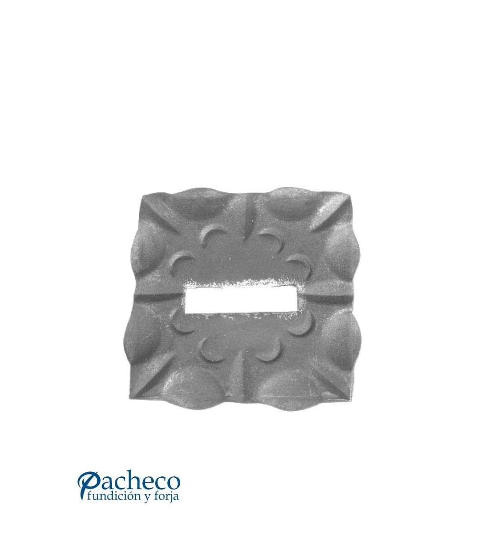 Base de hierro forjado utilizado como forja decorativa fabricado con hierro dulce, maleable y forjado en caliente. Este accesorio en hierro forjado se utiliza como soporte en rejas o barandillas de hierro forjado. Se puede combinar con pletina. La medida estándar es de 90 mm alto x 90 mm ancho. Piezas y accesorios para forja a medida, también realizamos cualquier diseño de forja decorativa y forja artística. Consulta a nuestro equipo de diseño especializado. Aquí los límites del metal, los pones tú. Llámanos para informarte al 923 24 33 98 o escríbenos a info@pachecoforja.com