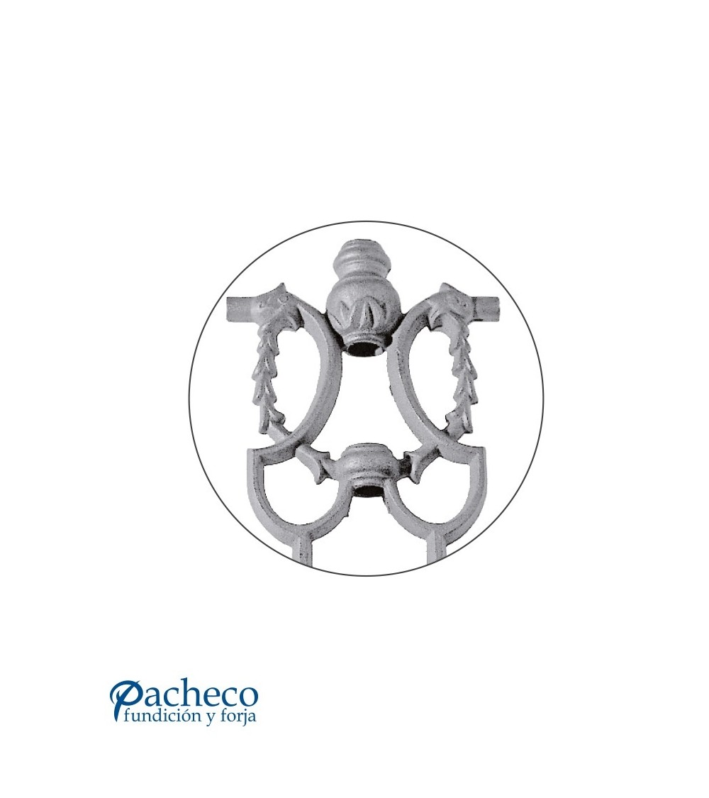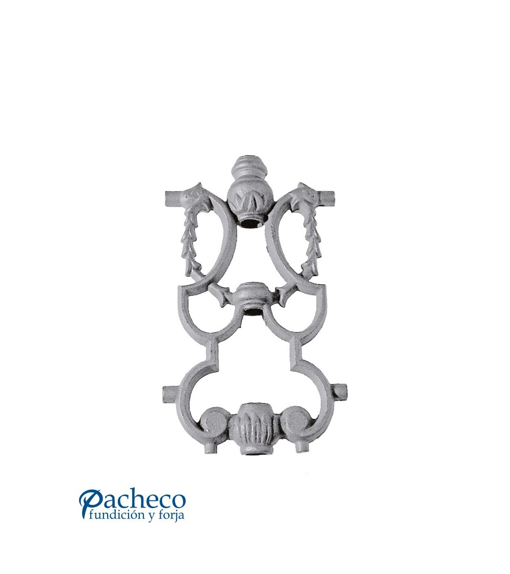 Pieza central de hierro fundido utilizado como forja decorativa fabricado con hierro fundido con molde. Se aconseja no galvanizar en caliente. Este accesorio en hierro fundido se utiliza como adorno en puertas de forja, ventanas de forja o balcones de forja. Se combina con balaustres de hierro forjado o balaustres de hierro fundido. La medida estándar es 250 mm alto x 145 mm ancho. Piezas y accesorios de hierro fundido a medida, también realizamos cualquier diseño de hierro fundido y forja decorativa. Consulta a nuestro equipo de diseño especializado. Aquí los límites del metal, los pones tú. Llámanos para informarte al 923 24 33 98 o escríbenos a info@pachecoforja.com