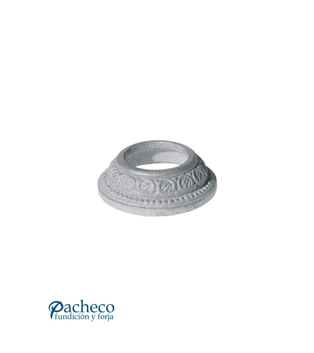 Base de hierro fundido utilizado como forja decorativa fabricado con hierro fundido con molde para tubo redondo. Se aconseja no galvanizar en caliente. Este accesorio en hierro fundido se utiliza como adorno para subida de escalera de forja. Se combina con balaustres de hierro forjado o balaustres de hierro fundido. La medida estándar 110 mm alto x 110 mm ancho. Piezas y accesorios de hierro fundido a medida, también realizamos cualquier diseño de hierro fundido y forja decorativa. Consulta a nuestro equipo de diseño especializado. Aquí los límites del metal, los pones tú. Llámanos para informarte al 923 24 33 98 o escríbenos a info@pachecoforja.com