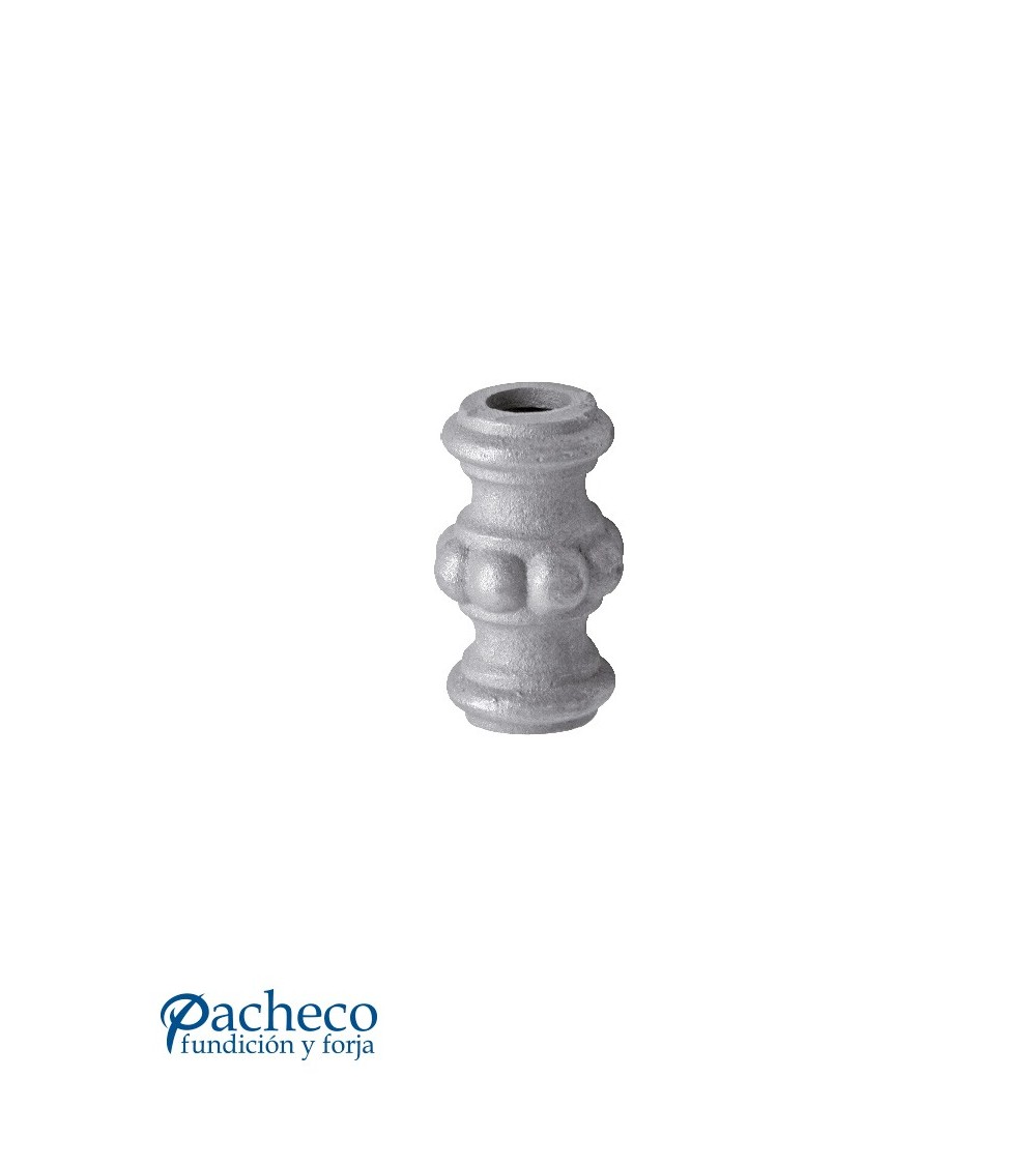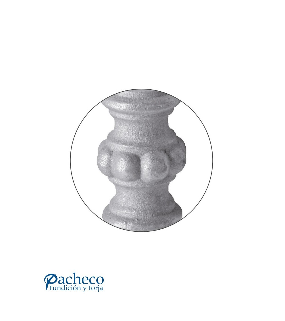 Macolla de hierro fundido utilizado como forja decorativa fabricado con hierro fundido con molde para tubo redondo. Se aconseja no galvanizar en caliente. Este accesorio en hierro fundido se utiliza como adorno en puertas de forja, ventanas de forja o balcones de forja. Se combina con balaustres de hierro forjado o balaustres de hierro fundido. La medida estándar es de 72 mm alto x 40 mm ancho. Piezas y accesorios de hierro fundido a medida, también realizamos cualquier diseño de hierro fundido y forja decorativa. Consulta a nuestro equipo de diseño especializado. Aquí los límites del metal, los pones tú. Llámanos para informarte al 923 24 33 98 o escríbenos a info@pachecoforja.com