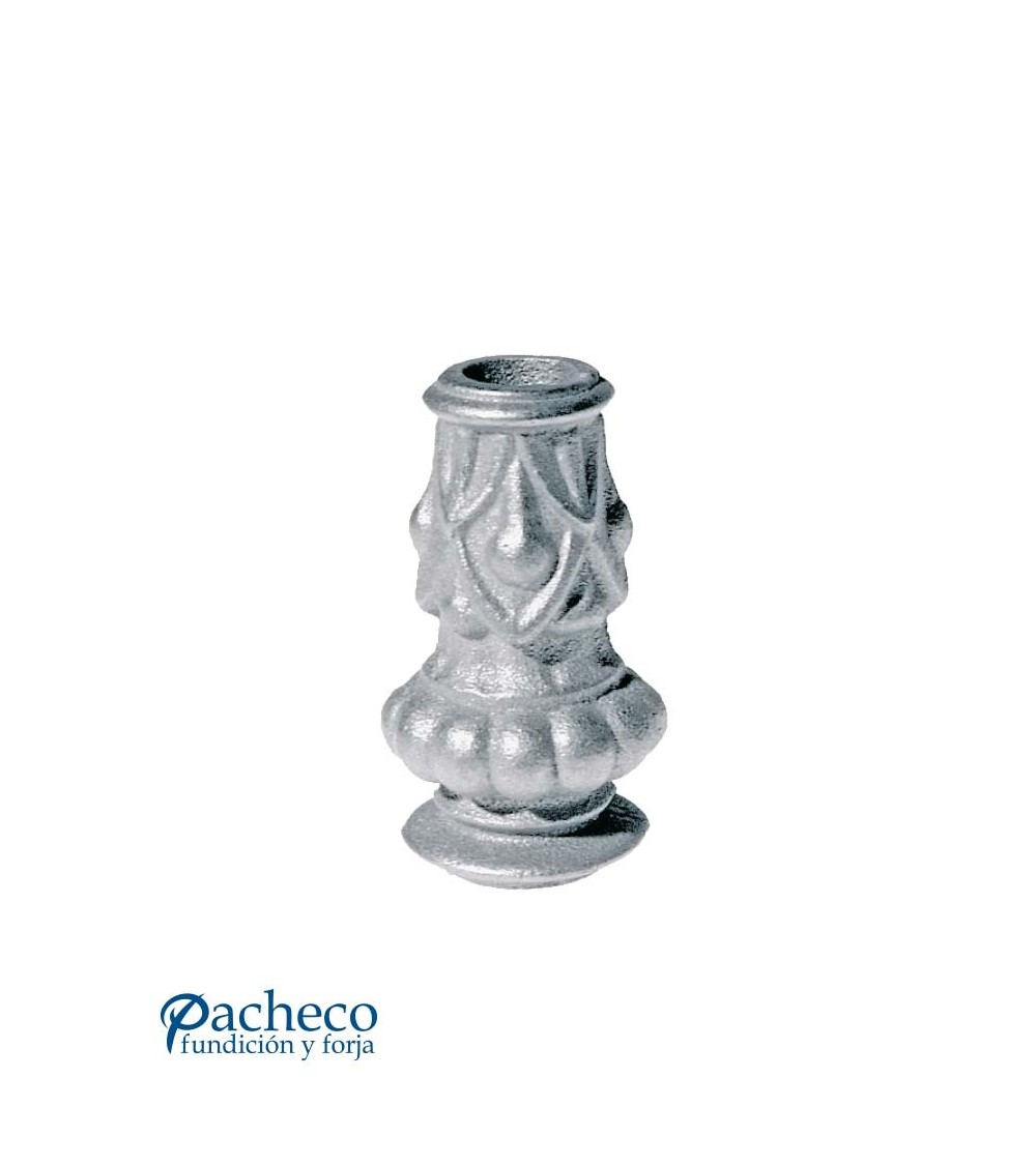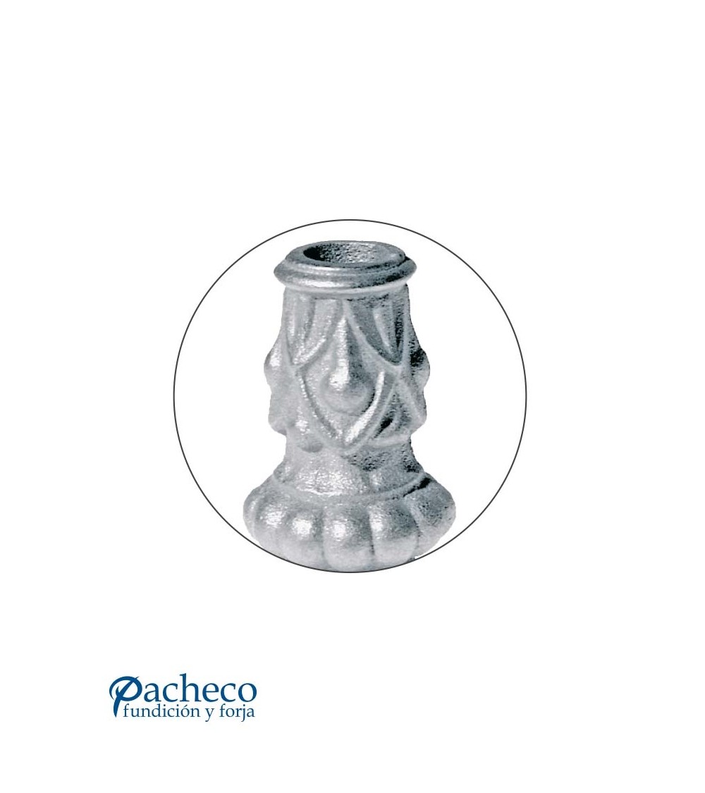 Base de hierro fundido utilizado como forja decorativa fabricado con hierro fundido con molde para tubo redondo. Se aconseja no galvanizar en caliente. Este accesorio en hierro fundido se utiliza como adorno para subida de escalera de forja. Se combina con balaustres de hierro forjado o balaustres de hierro fundido. La medida estándar 85 mm alto x 40 mm ancho. Piezas y accesorios de hierro fundido a medida, también realizamos cualquier diseño de hierro fundido y forja decorativa. Consulta a nuestro equipo de diseño especializado. Aquí los límites del metal, los pones tú. Llámanos para informarte al 923 24 33 98 o escríbenos a info@pachecoforja.com