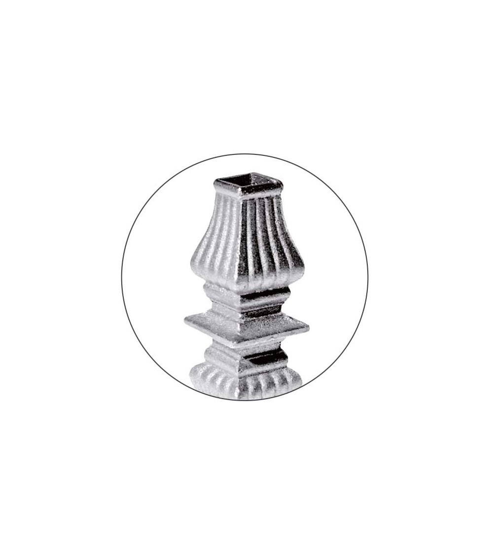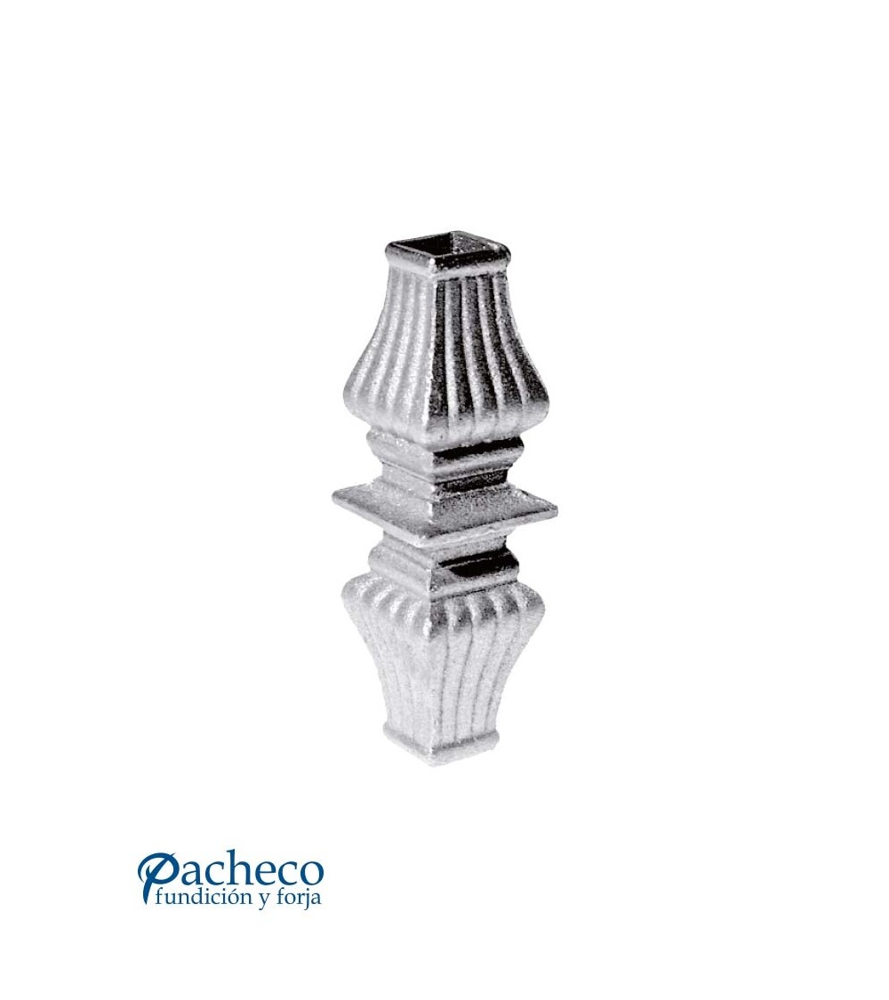 Macolla de hierro fundido utilizado como forja decorativa fabricado con hierro fundido con molde para tubo cuadrado. Se aconseja no galvanizar en caliente. Este accesorio en hierro fundido se utiliza como adorno en puertas de forja, ventanas de forja o balcones de forja. Se combina con balaustres de hierro forjado o balaustres de hierro fundido. La medida estándar es de 147 mm alto x 45 mm ancho. Piezas y accesorios de hierro fundido a medida, también realizamos cualquier diseño de hierro fundido y forja decorativa. Consulta a nuestro equipo de diseño especializado. Aquí los límites del metal, los pones tú. Llámanos para informarte al 923 24 33 98 o escríbenos a info@pachecoforja.com