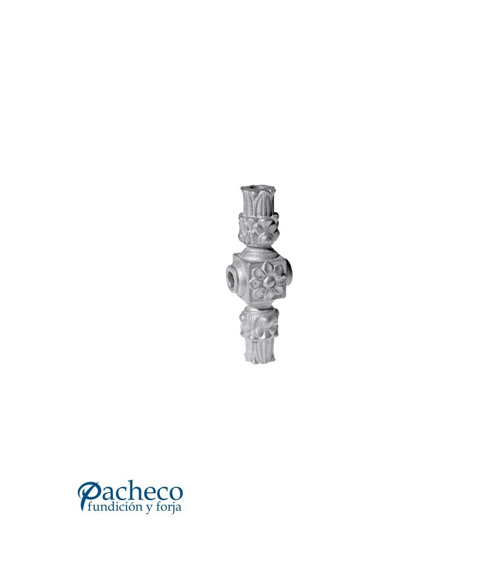 Macolla de hierro fundido utilizado como forja decorativa fabricado con hierro fundido con molde para tubo redondo. Se aconseja no galvanizar en caliente. Este accesorio en hierro fundido se utiliza como adorno en puertas de forja, ventanas de forja o balcones de forja. Se combina con balaustres de hierro forjado o balaustres de hierro fundido. La medida estándar es de 105 mm alto x 80 mm ancho. Piezas y accesorios de hierro fundido a medida, también realizamos cualquier diseño de hierro fundido y forja decorativa. Consulta a nuestro equipo de diseño especializado. Aquí los límites del metal, los pones tú.
