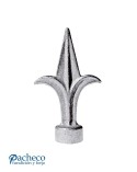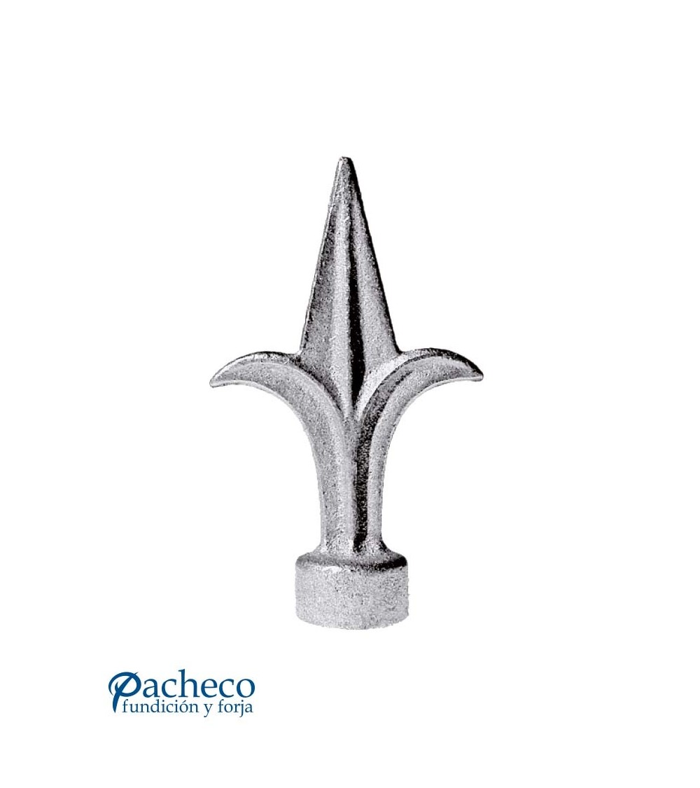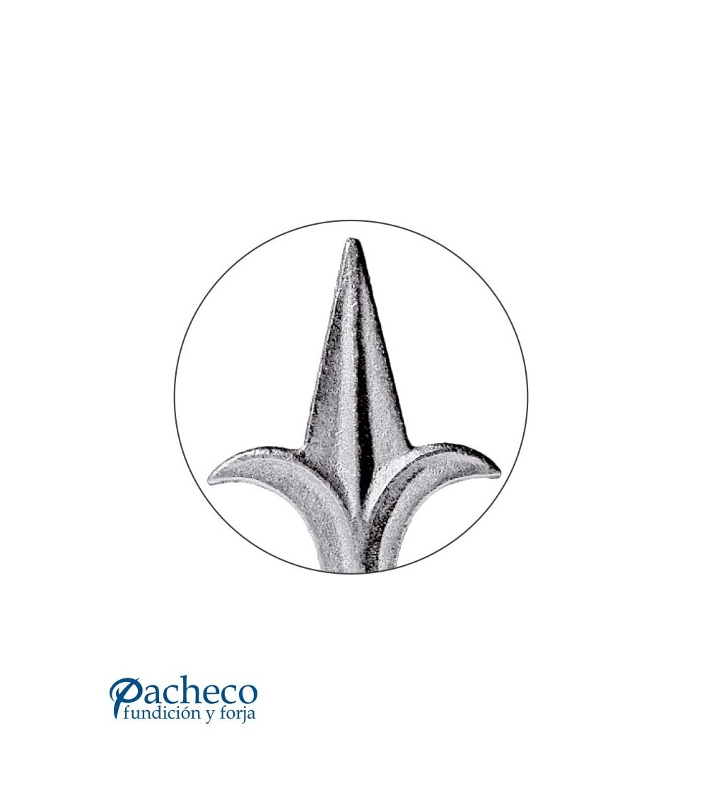 Lanza de hierro fundido utilizado como remate de forja decorativa fabricado con hierro fundido con molde. Se aconseja no galvanizar en caliente. Este accesorio en hierro fundido se utiliza como remate de forja en puertas de forja o balcones de forja. Va soldado en balaustres de hierro forjado o balaustres de hierro fundido. La medida estándar es de 135 mm alto x 75 mm ancho. Piezas y accesorios de hierro fundido a medida, también realizamos cualquier diseño de hierro fundido y forja decorativa. Consulta a nuestro equipo de diseño especializado. Aquí los límites del metal, los pones tú. Llámanos para informarte al 923 24 33 98 o escríbenos a info@pachecoforja.com