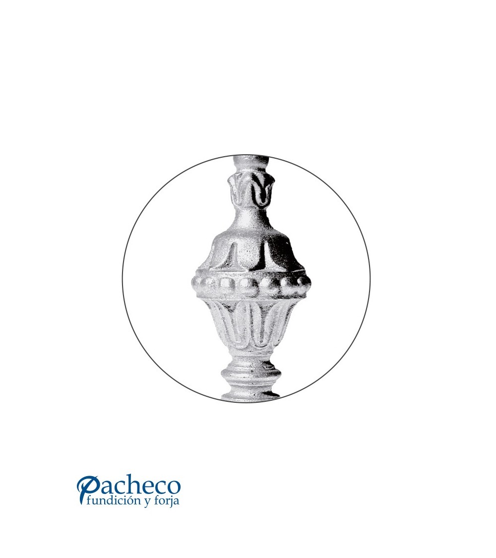 Remate de hierro fundido en forma de piña utilizado como forja decorativa fabricado con hierro fundido con molde. Se aconseja no galvanizar en caliente. Este accesorio en hierro fundido se utiliza como adorno en puertas de forja, subidas de escalera de forja o balcones de forja. Va soldado en balaustres de hierro forjado o balaustres de hierro fundido. La medida estándar es 175 mm alto x 75 mm ancho. Piezas y accesorios de hierro fundido a medida, también realizamos cualquier diseño de hierro fundido y forja decorativa. Consulta a nuestro equipo de diseño especializado. Aquí los límites del metal, los pones tú. Llámanos para informarte al 923 24 33 98 o escríbenos a info@pachecoforja.com