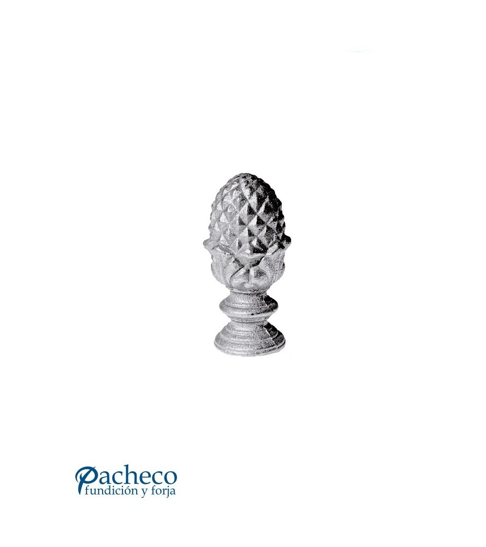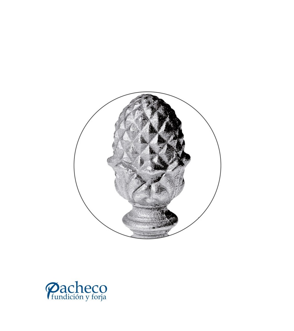 Remate de hierro fundido en forma de piña utilizado como forja decorativa fabricado con hierro fundido con molde. Se aconseja no galvanizar en caliente. Este accesorio en hierro fundido se utiliza como adorno en puertas de forja, subidas de escalera de forja o balcones de forja. Va soldado en balaustres de hierro forjado o balaustres de hierro fundido. La medida estándar es 160 mm alto x 80 mm ancho. Piezas y accesorios de hierro fundido a medida, también realizamos cualquier diseño de hierro fundido y forja decorativa. Consulta a nuestro equipo de diseño especializado. Aquí los límites del metal, los pones tú. Llámanos para informarte al 923 24 33 98 o escríbenos a info@pachecoforja.com