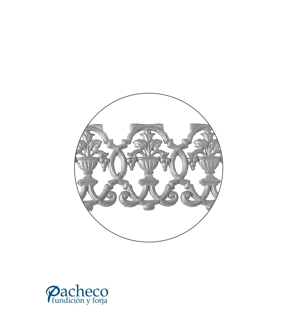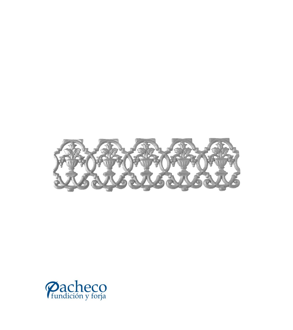Solera de hierro fundido utilizado como forja decorativa fabricado con hierro fundido con molde. Se aconseja no galvanizar en caliente. Este accesorio en hierro fundido se utiliza en el extremo inferior de puertas de forja, ventanas de forja o balcones de forja. Se combina con balaustres de hierro forjado o balaustres de hierro fundido. La medida estándar es 180 mm alto x 520 mm ancho. Piezas y accesorios de hierro fundido a medida, también realizamos cualquier diseño de hierro fundido y forja decorativa. Consulta a nuestro equipo de diseño especializado. Aquí los límites del metal, los pones tú. Llámanos para informarte al 923 24 33 98 o escríbenos a info@pachecoforja.com