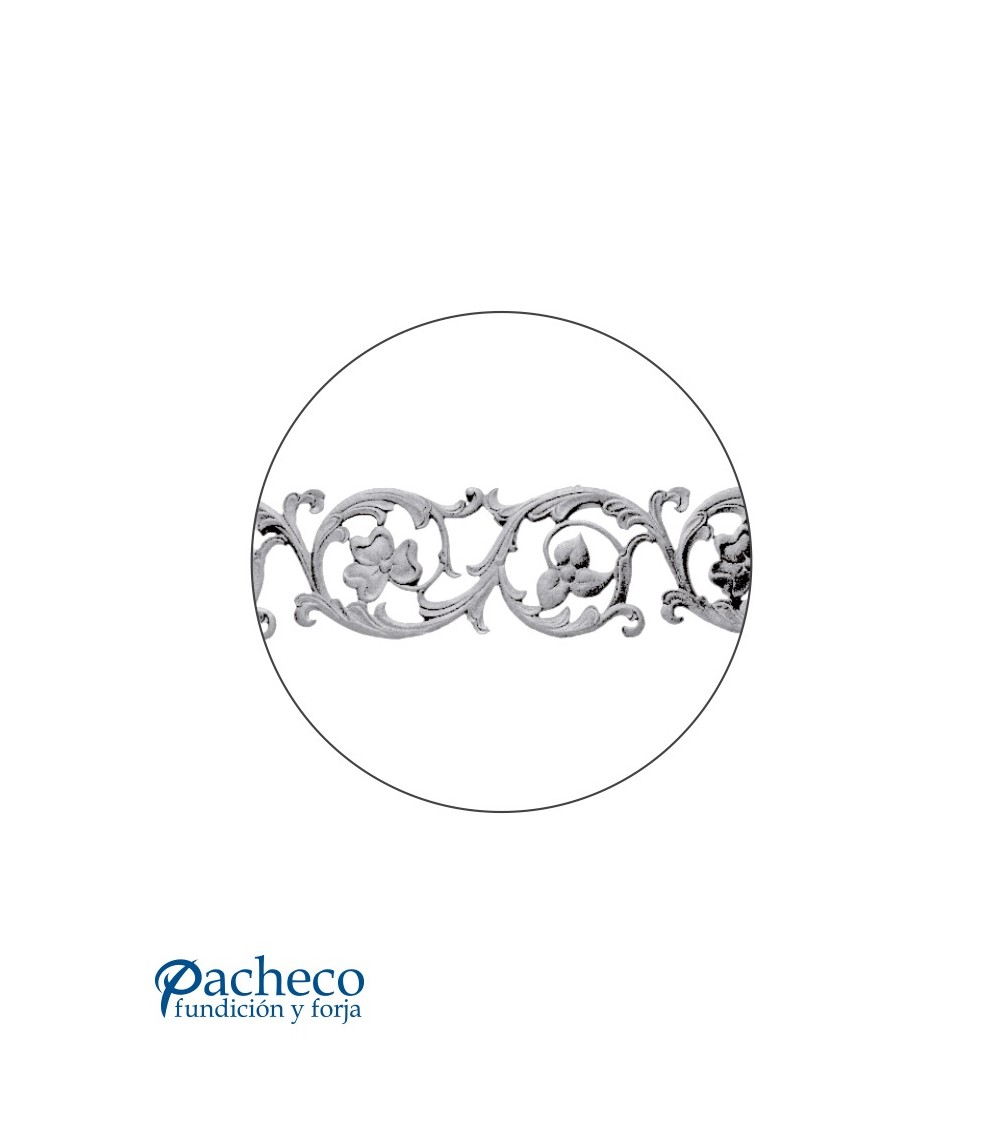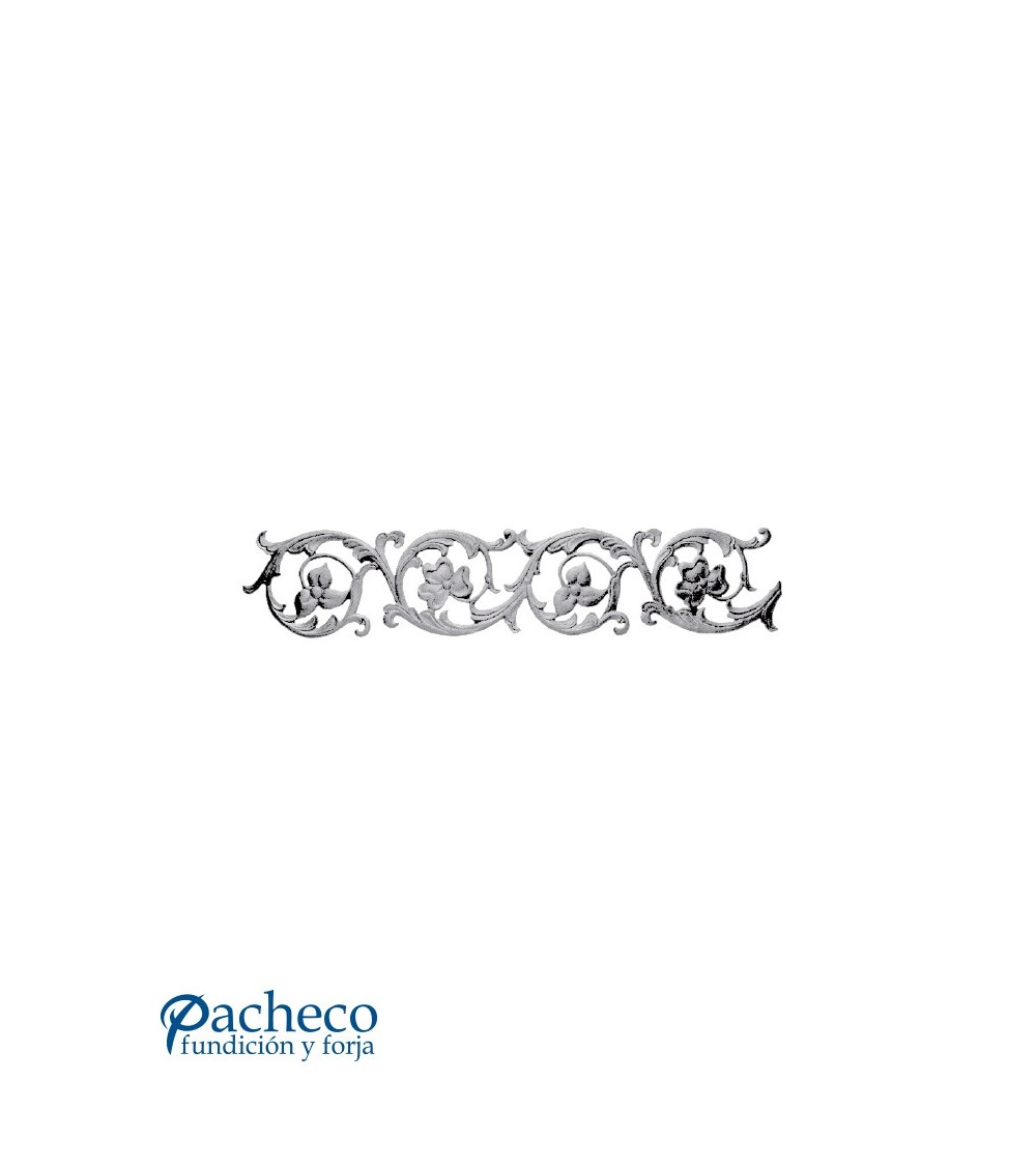 Solera de hierro fundido utilizado como forja decorativa fabricado con hierro fundido con molde. Se aconseja no galvanizar en caliente. Este accesorio en hierro fundido se utiliza en el extremo inferior de puertas de forja, ventanas de forja o balcones de forja. Se combina con balaustres de hierro forjado o balaustres de hierro fundido. La medida estándar es 180 mm alto x 930 mm ancho. Piezas y accesorios de hierro fundido a medida, también realizamos cualquier diseño de hierro fundido y forja decorativa. Consulta a nuestro equipo de diseño especializado. Aquí los límites del metal, los pones tú. Llámanos para informarte al 923 24 33 98 o escríbenos a info@pachecoforja.com
