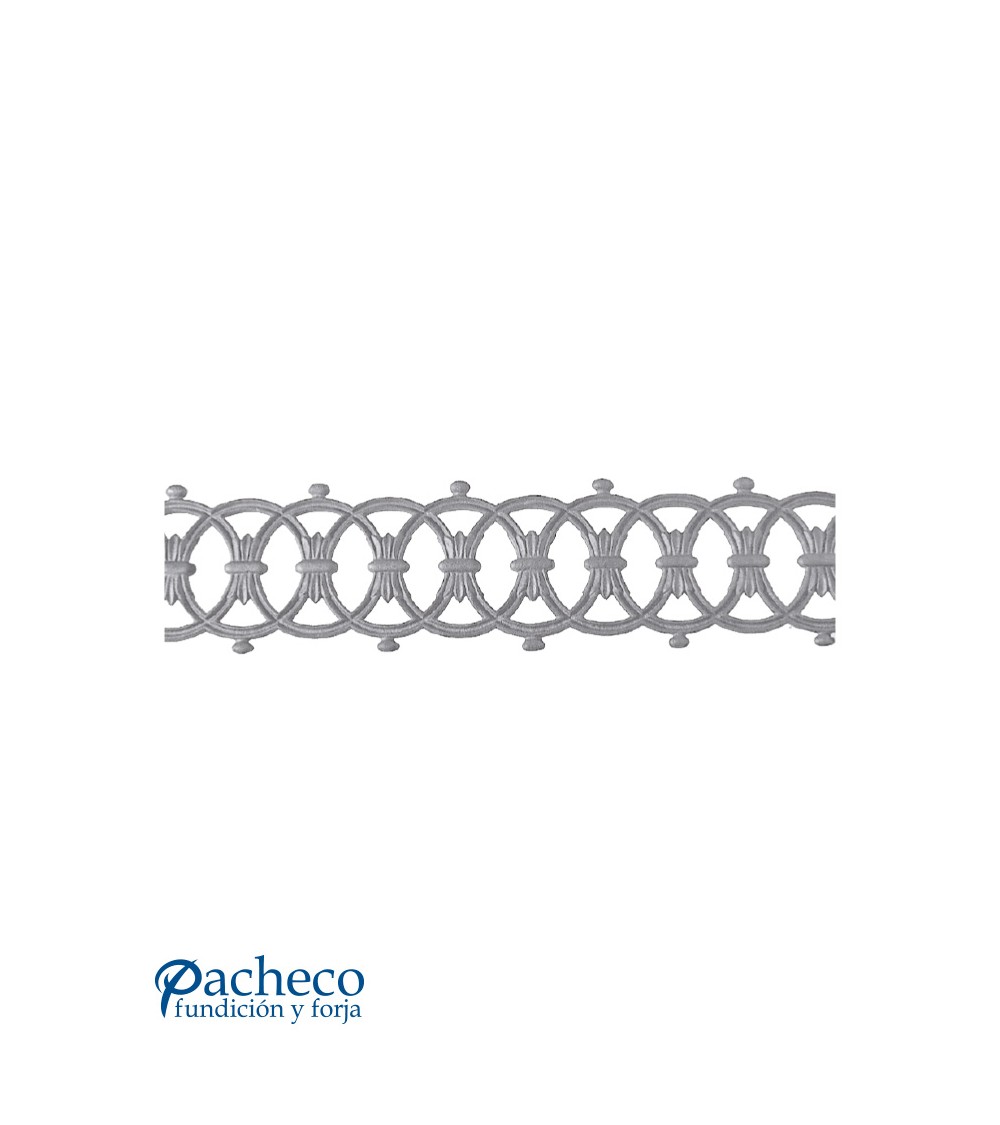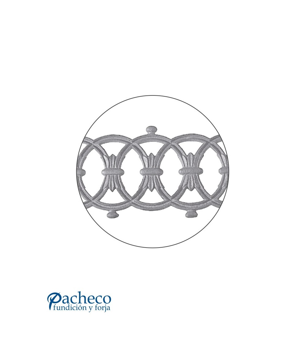Solera de hierro fundido utilizado como forja decorativa fabricado con hierro fundido con molde. Se aconseja no galvanizar en caliente. Este accesorio en hierro fundido se utiliza en el extremo inferior de puertas de forja, ventanas de forja o balcones de forja. Se combina con balaustres de hierro forjado o balaustres de hierro fundido. La medida estándar es 150 mm alto x 700 mm ancho. Piezas y accesorios de hierro fundido a medida, también realizamos cualquier diseño de hierro fundido y forja decorativa. Consulta a nuestro equipo de diseño especializado. Aquí los límites del metal, los pones tú. Llámanos para informarte al 923 24 33 98 o escríbenos a info@pachecoforja.com
