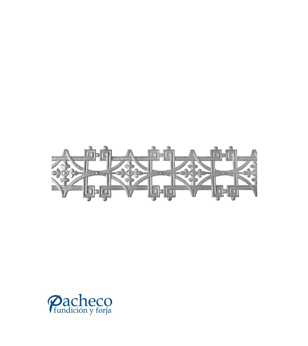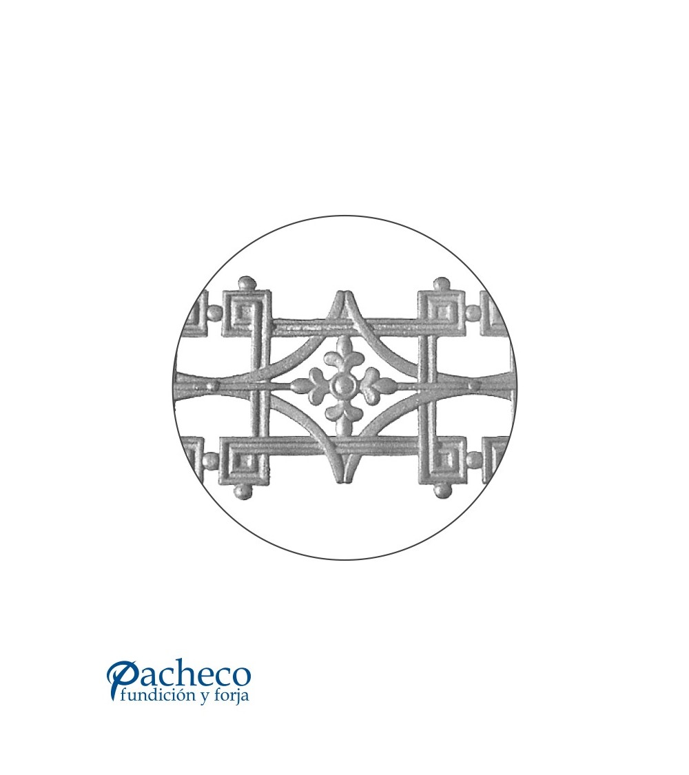Solera de hierro fundido utilizado como forja decorativa fabricado con hierro fundido con molde. Se aconseja no galvanizar en caliente. Este accesorio en hierro fundido se utiliza en el extremo inferior de puertas de forja, ventanas de forja o balcones de forja. Se combina con balaustres de hierro forjado o balaustres de hierro fundido. La medida estándar es 170 mm alto x 960 mm ancho. Piezas y accesorios de hierro fundido a medida, también realizamos cualquier diseño de hierro fundido y forja decorativa. Consulta a nuestro equipo de diseño especializado. Aquí los límites del metal, los pones tú. Llámanos para informarte al 923 24 33 98 o escríbenos a info@pachecoforja.com