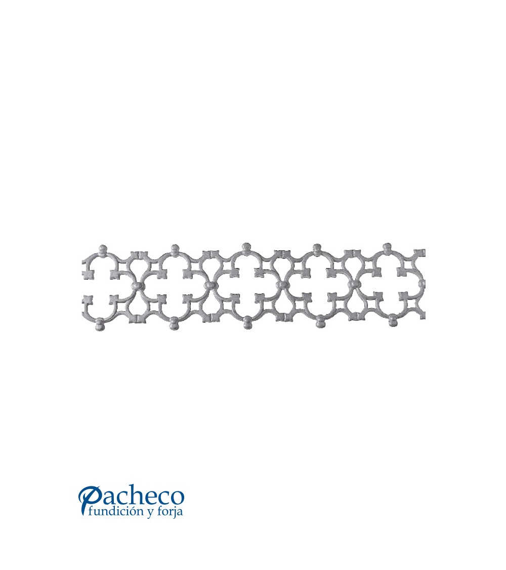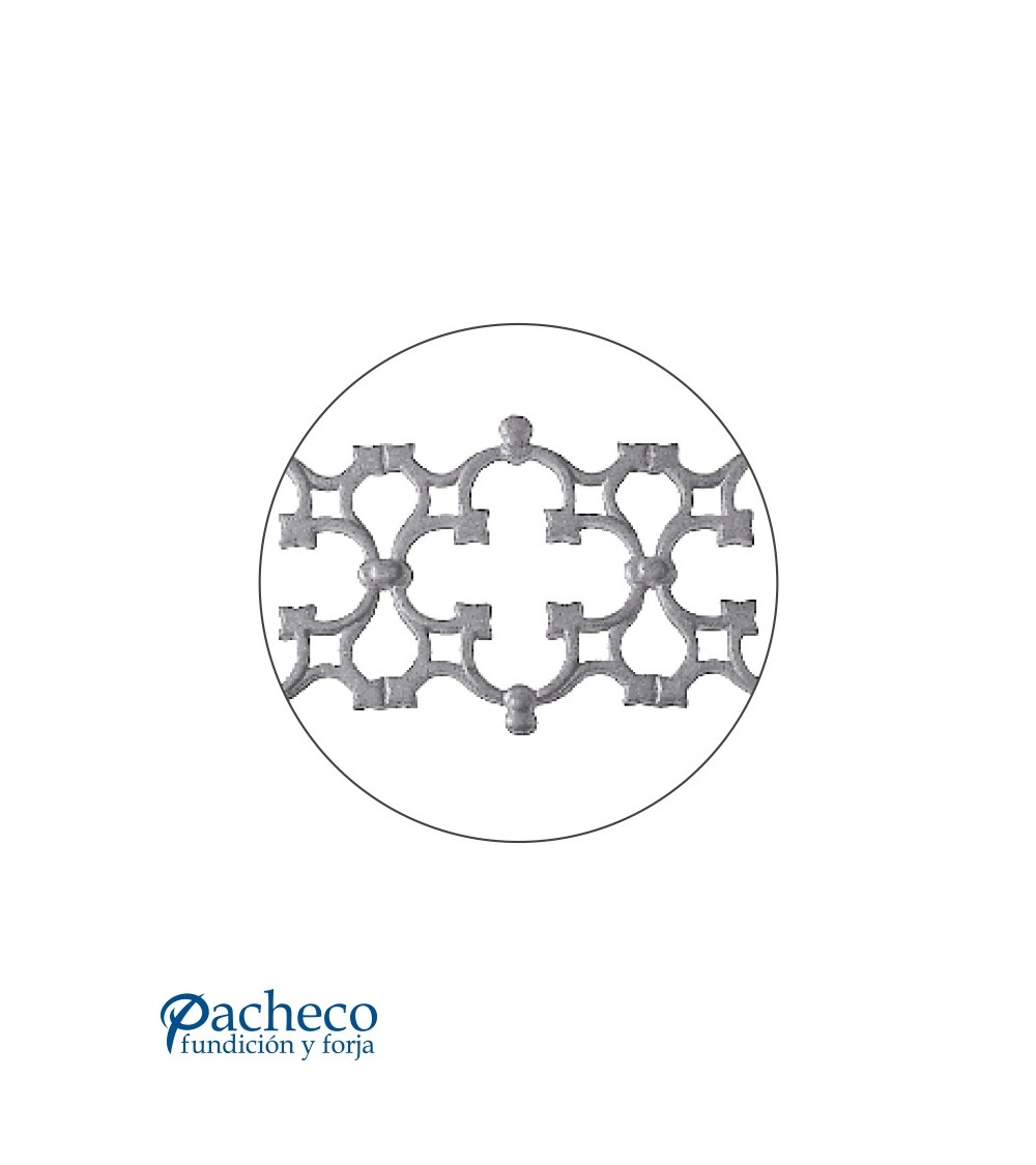 Solera de hierro fundido utilizado como forja decorativa fabricado con hierro fundido con molde. Se aconseja no galvanizar en caliente. Este accesorio en hierro fundido se utiliza en el extremo inferior de puertas de forja, ventanas de forja o balcones de forja. Se combina con balaustres de hierro forjado o balaustres de hierro fundido. La medida estándar es 160 mm alto x 950 mm ancho. Piezas y accesorios de hierro fundido a medida, también realizamos cualquier diseño de hierro fundido y forja decorativa. Consulta a nuestro equipo de diseño especializado. Aquí los límites del metal, los pones tú. Llámanos para informarte al 923 24 33 98 o escríbenos a info@pachecoforja.com