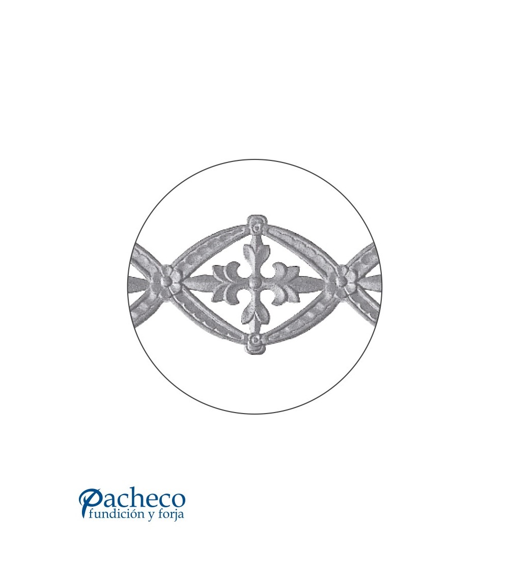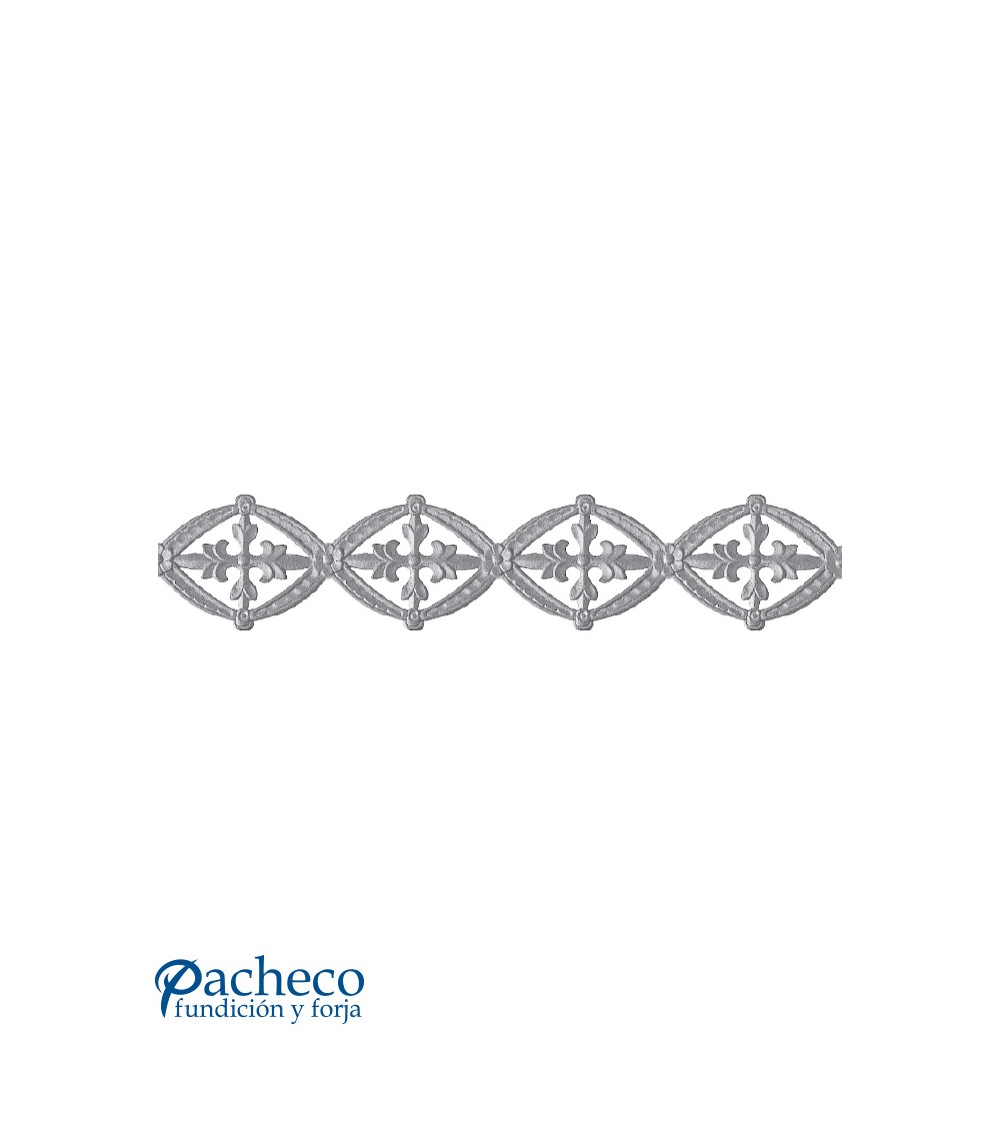 Solera de hierro fundido utilizado como forja decorativa fabricado con hierro fundido con molde. Se aconseja no galvanizar en caliente. Este accesorio en hierro fundido se utiliza en el extremo inferior de puertas de forja, ventanas de forja o balcones de forja. Se combina con balaustres de hierro forjado o balaustres de hierro fundido. La medida estándar es 160 mm alto x 1000 mm ancho. Piezas y accesorios de hierro fundido a medida, también realizamos cualquier diseño de hierro fundido y forja decorativa. Consulta a nuestro equipo de diseño especializado. Aquí los límites del metal, los pones tú. Llámanos para informarte al 923 24 33 98 o escríbenos a info@pachecoforja.com